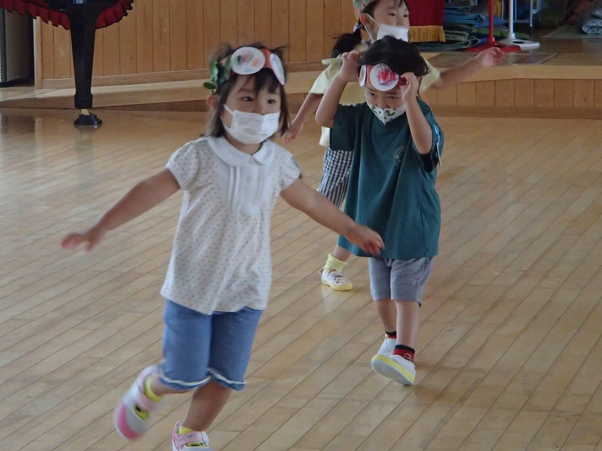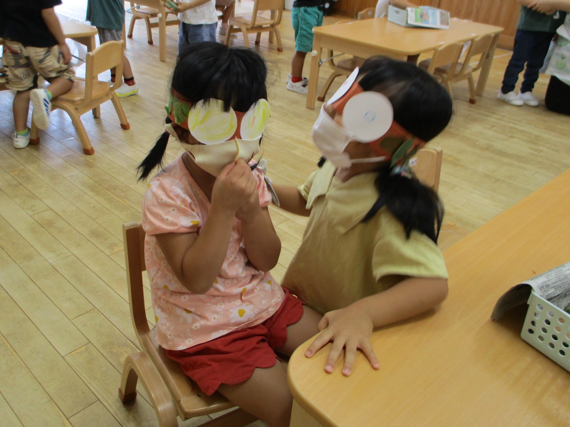 一つ一つをとても大切にしています。子ども達の興味が重なり、楽しいお面づくりや変身遊びになりました。