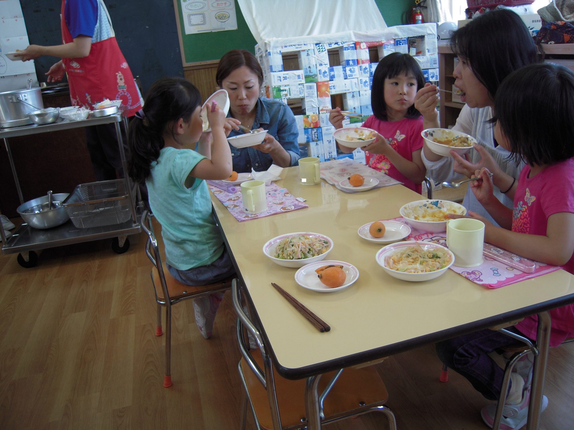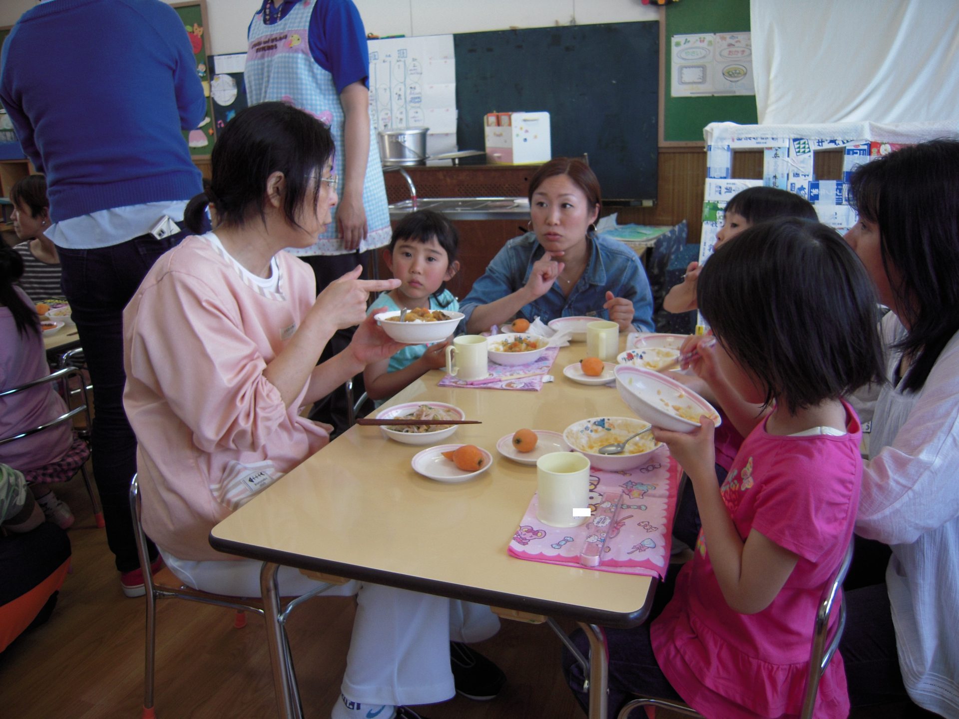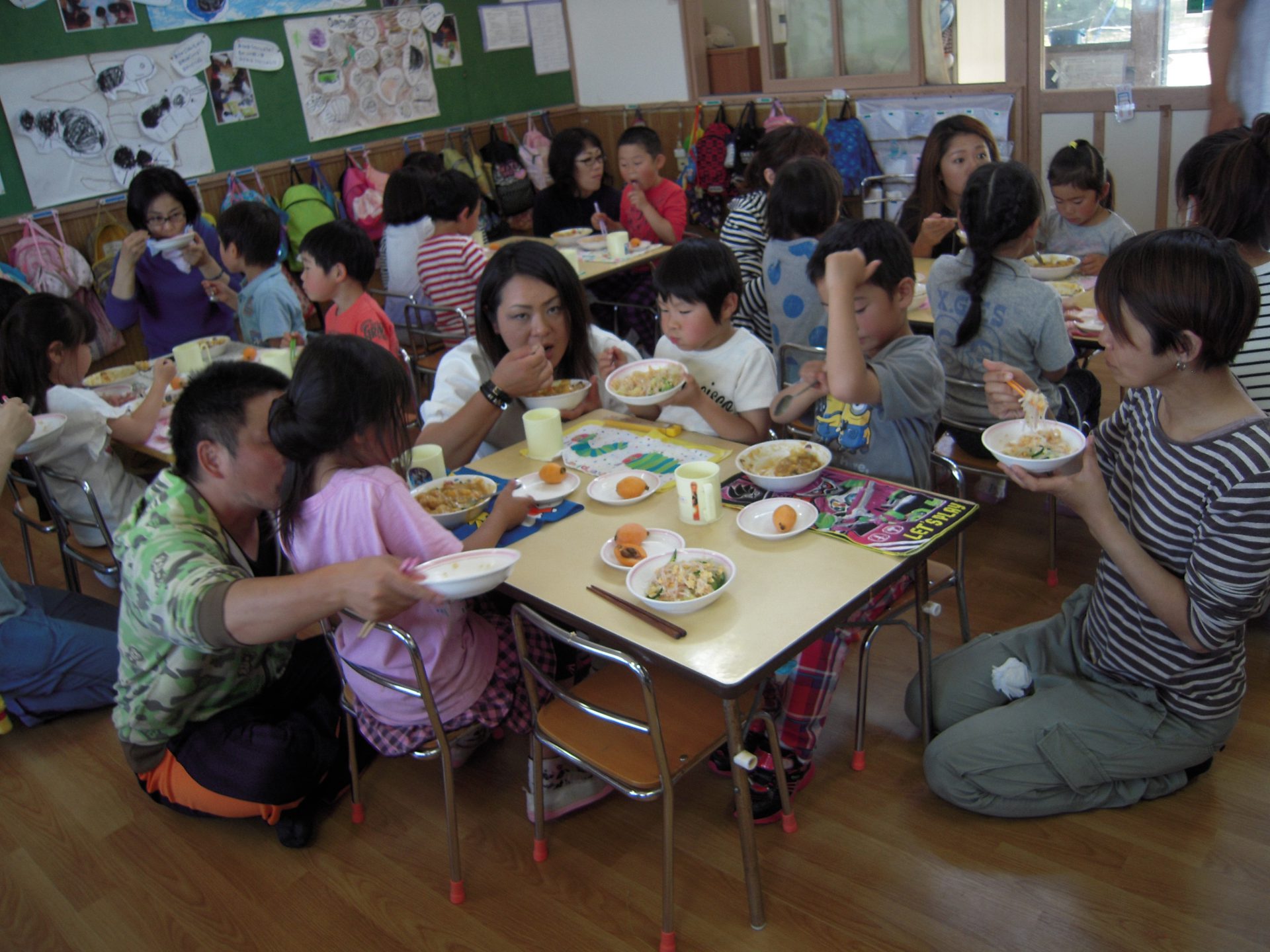 「保護者みなさん!今日は試食のためにいつもよりも量が多くなっています!お子さん達が食べきれないと困るので、ぜひ助けてあげてください!」