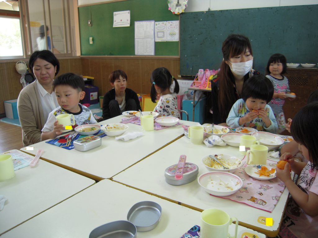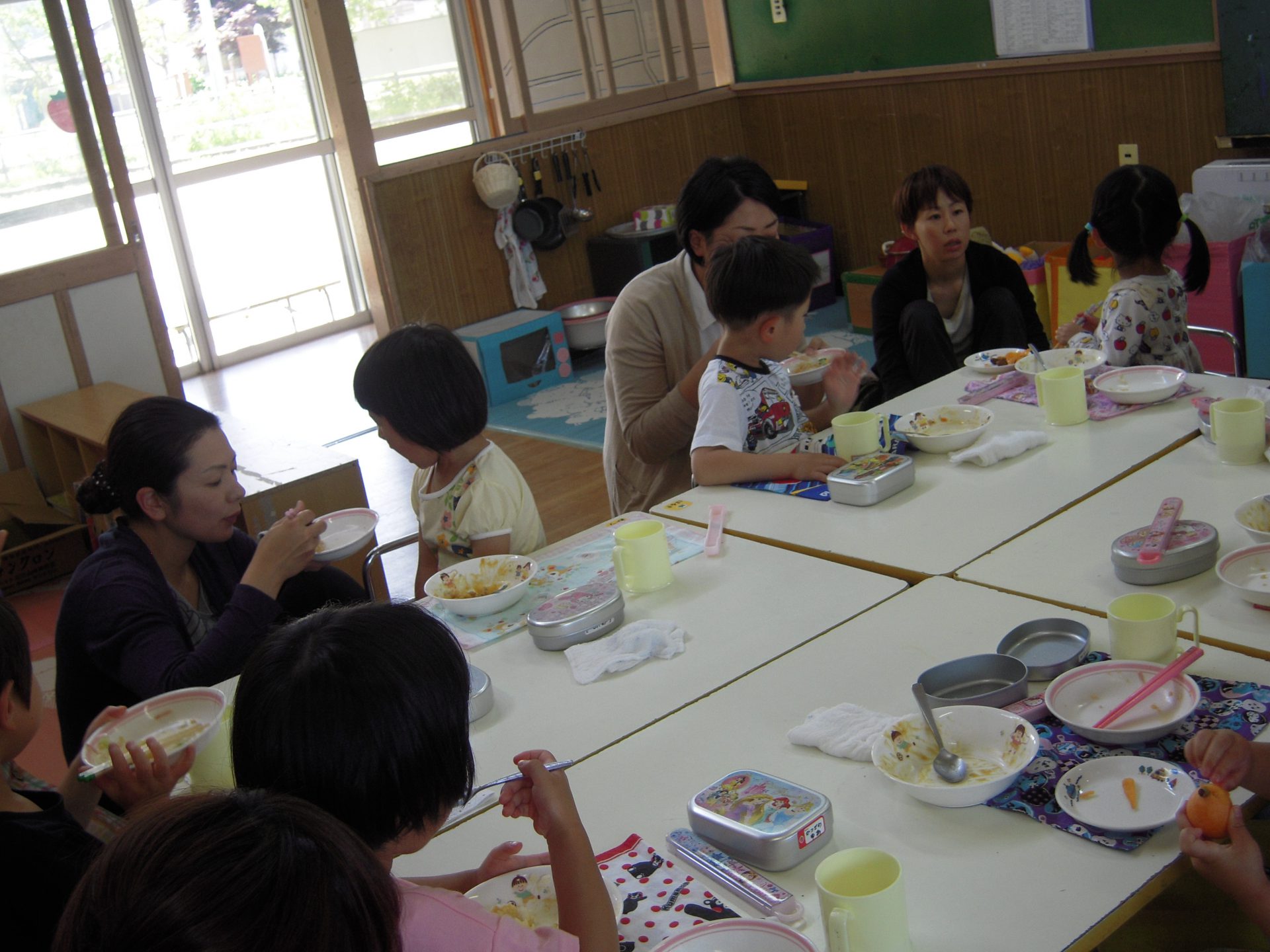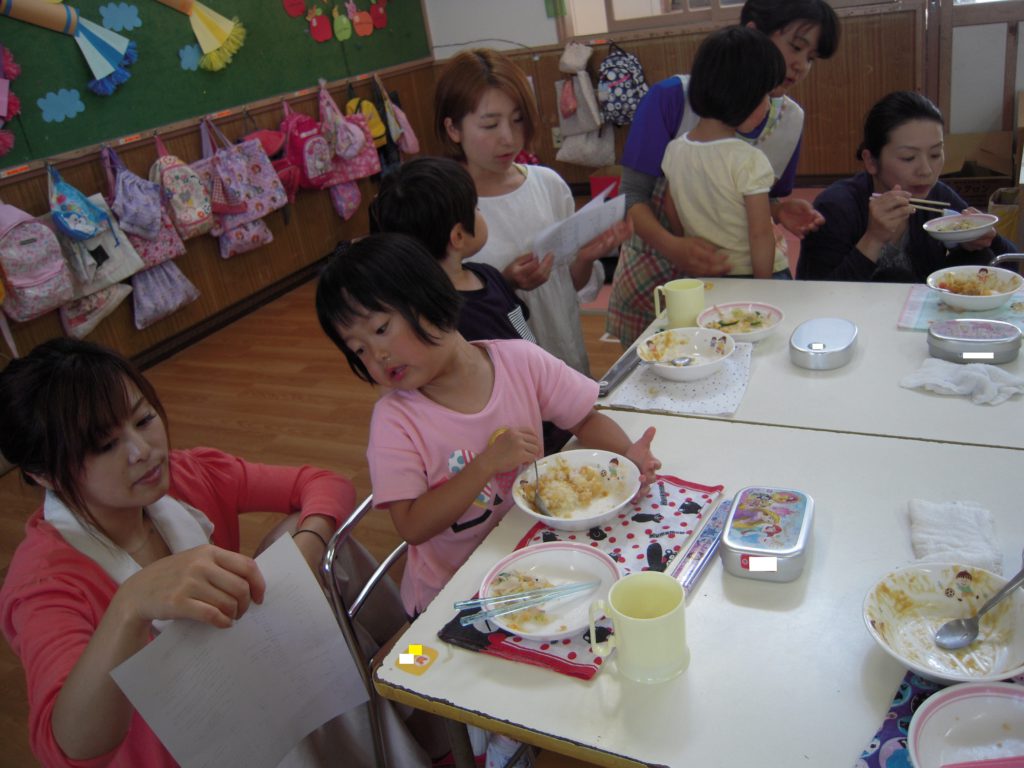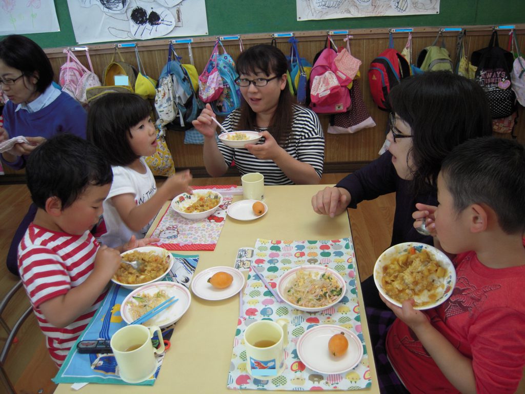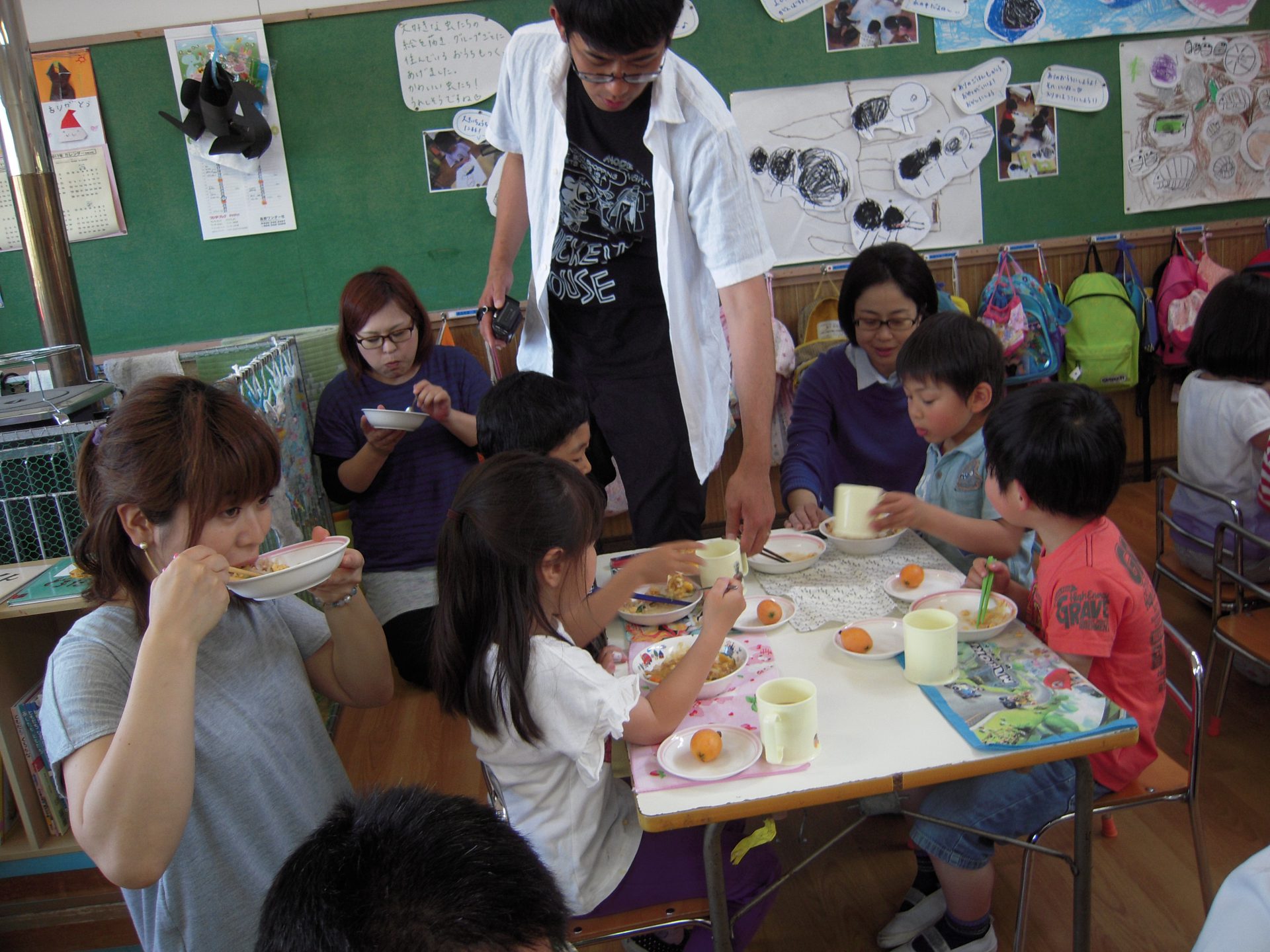 「保護者みなさん!今日は試食のためにいつもよりも量が多くなっています!お子さん達が食べきれないと困るので、ぜひ助けてあげてください!」