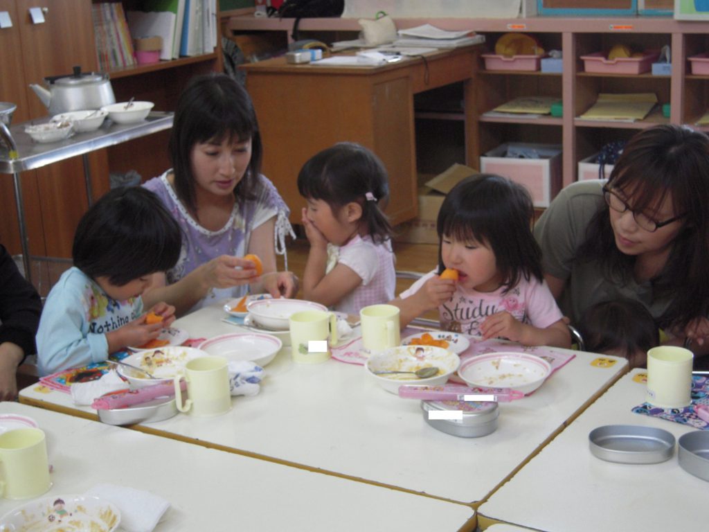 年少児さんは、栄養士が伺った時にはすでに食べ終えている子も多く、デザートの今が旬のびわを食べているところでした。