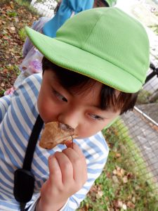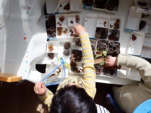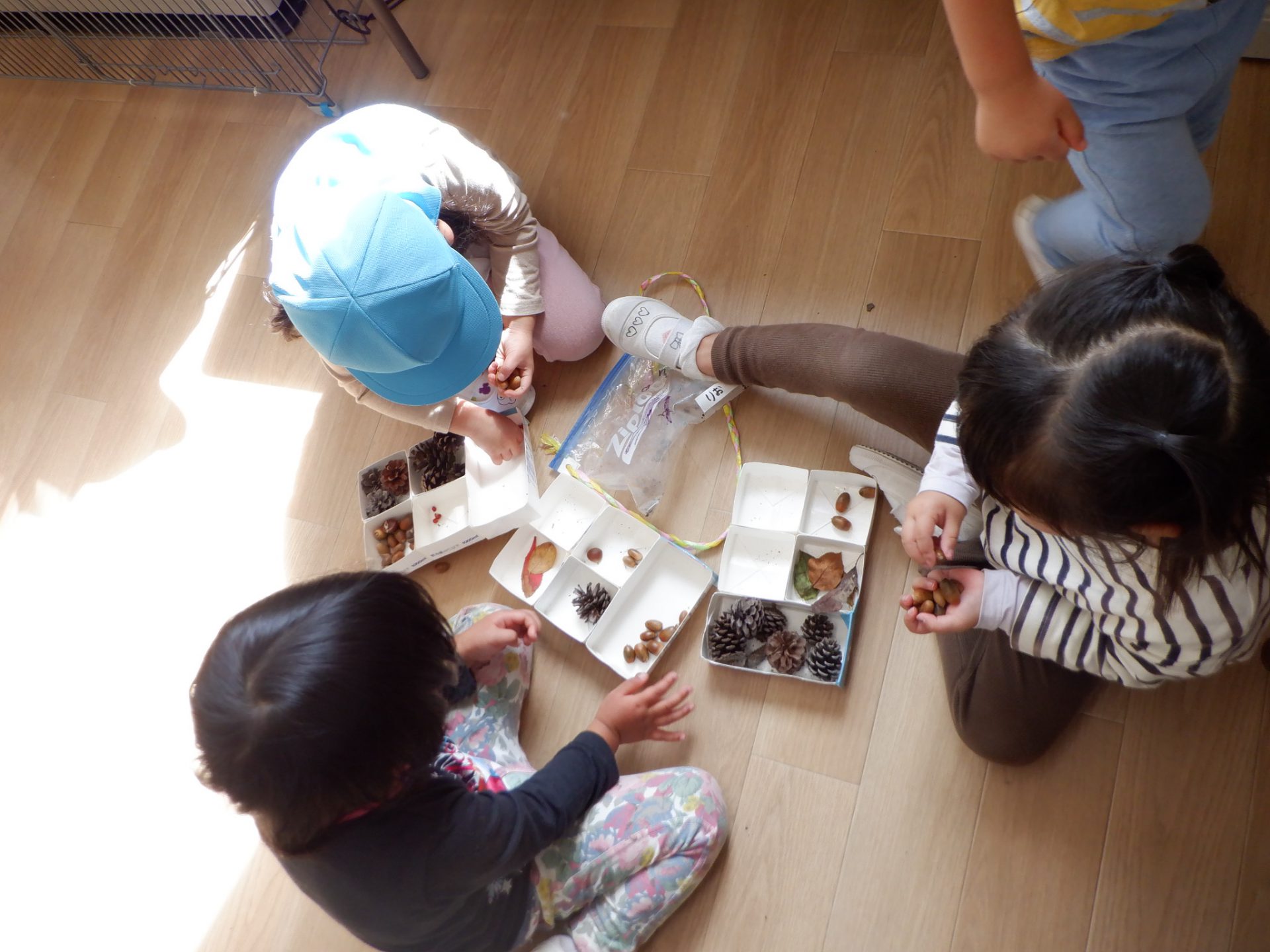 拾ってきたドングリ、栗、木の実など“宝物”を友だちと見せ合いながら箱に入れていました。