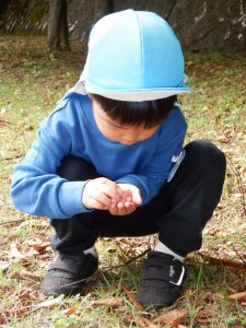 “これはなんだろう・・・???” 小さな手で大切に拾っています。