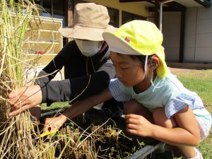 子どもたちが使い慣れているハサミで少しずつ稲を刈っていきました。