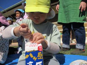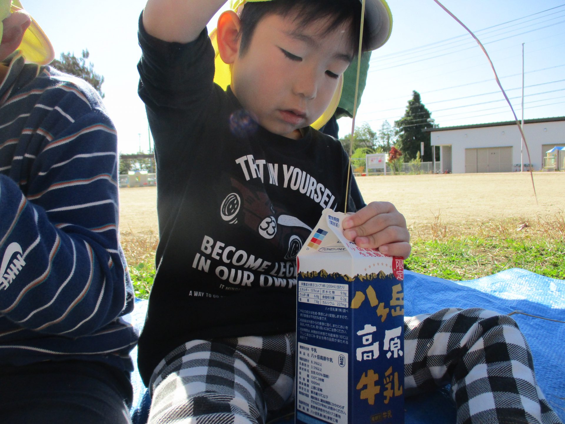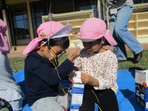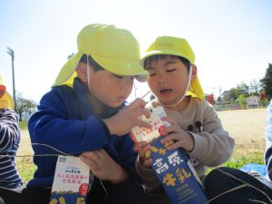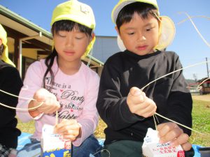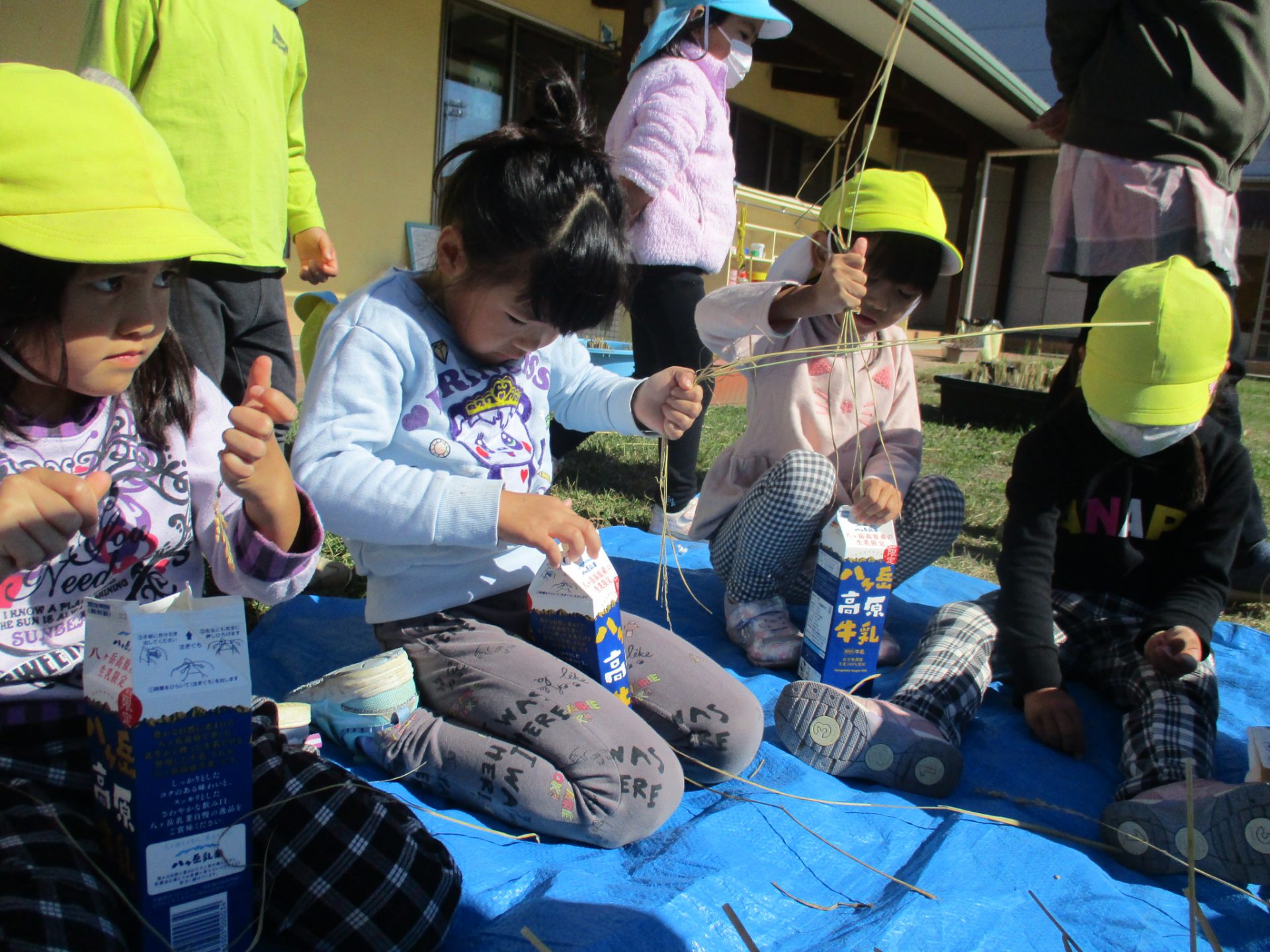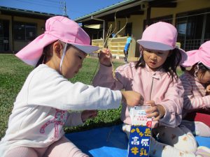 年中児は2人1組になり牛乳パックをおさえる人と稲を引っ張る人