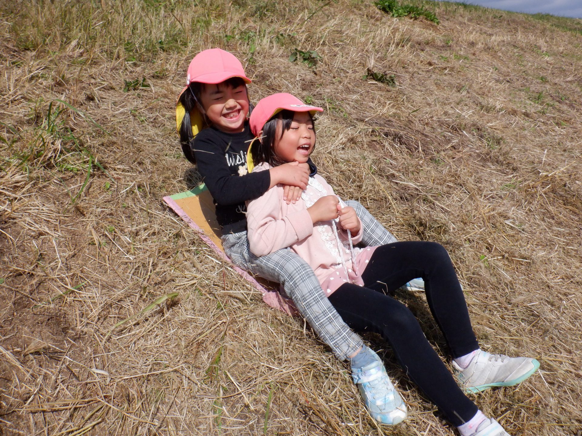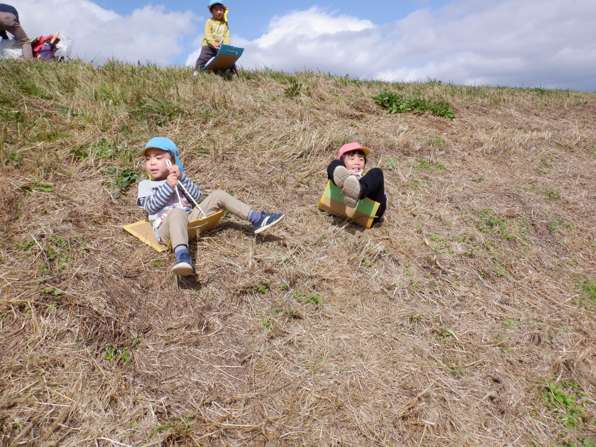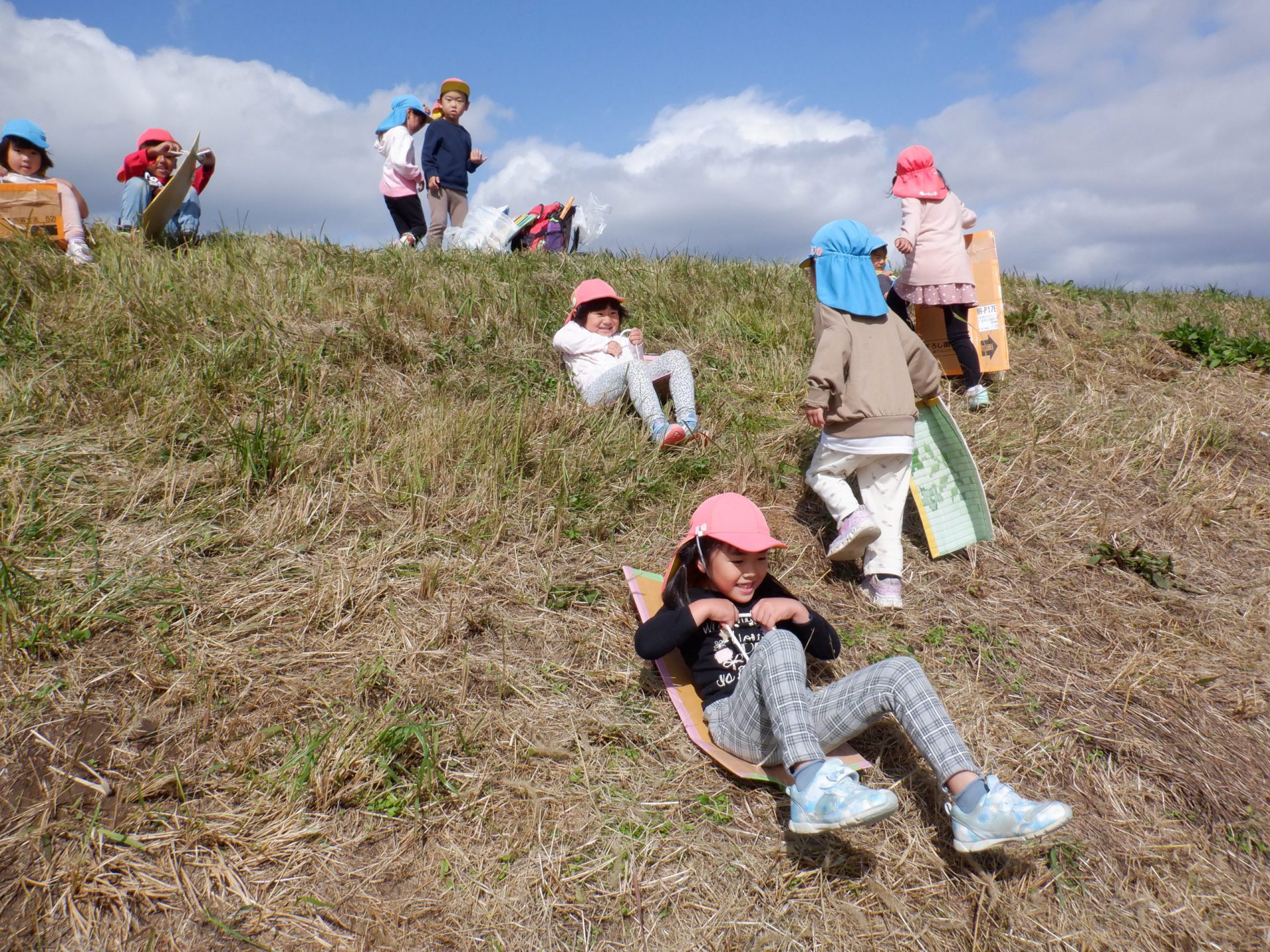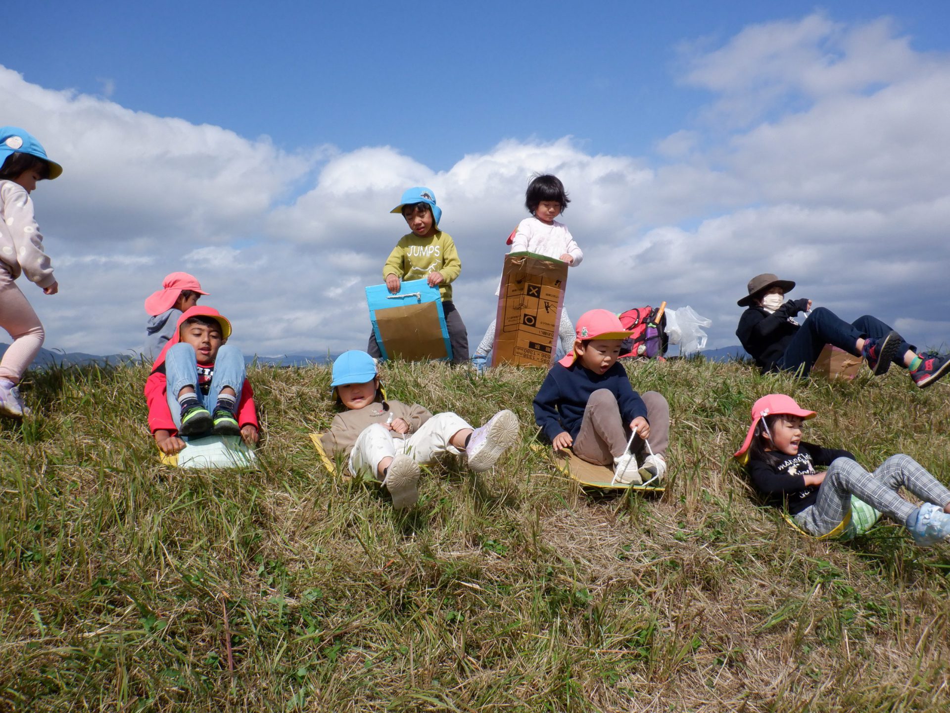 ・楽しみながら、全身を使って遊ぶことができたのでよかったです。また滑る中で、もっと早いスピードで滑るために、足を上げたり、乗っけたり、試行錯誤しながら見つけていく姿はさすがだなと思いました。さらに、ただ滑るだけでなく、友達を誘いあったり競争したりと、どんどん発展させて遊んでいる姿はさすが!!といった感じですね。