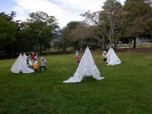 年中クラスで遊びに使っていたテントも建ててキャンプごっこもしました!