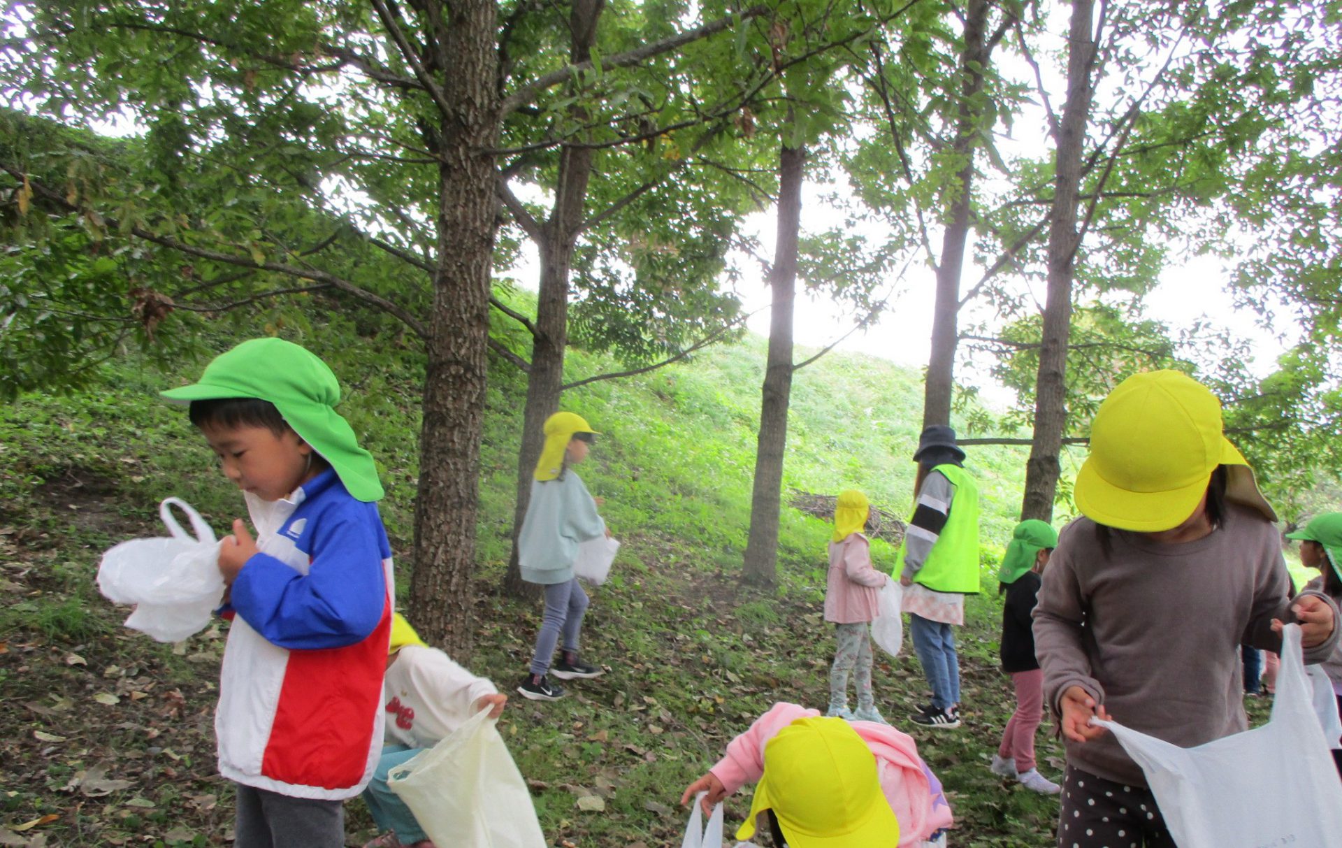 “どんぐりの森”と呼ばれている地域のドングリの木のある職員の敷地に年中・年長クラスでドングリ拾いに行きました。