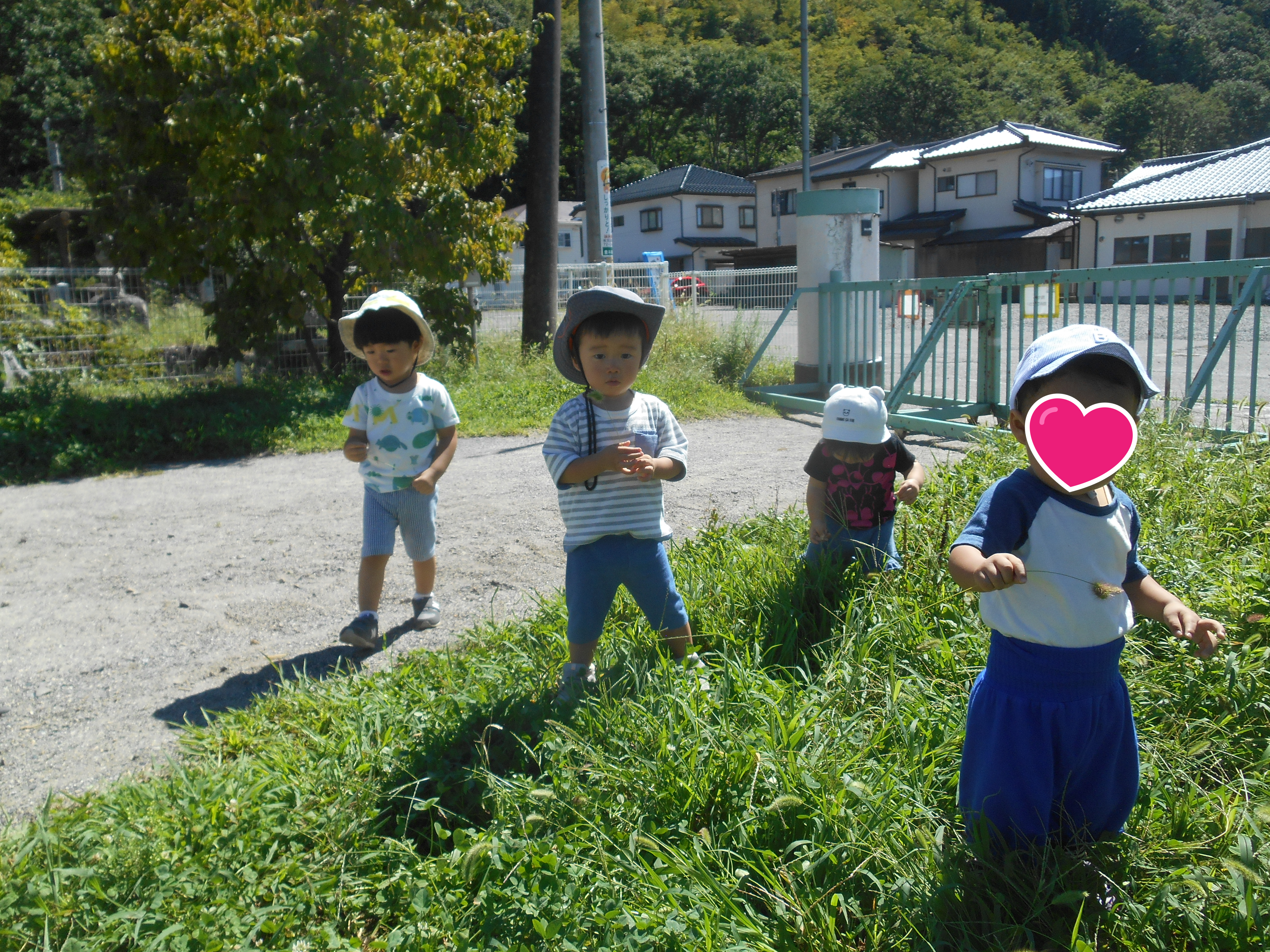 園庭に出かけるとねこじゃらしを見つけて摘んで遊んだり、