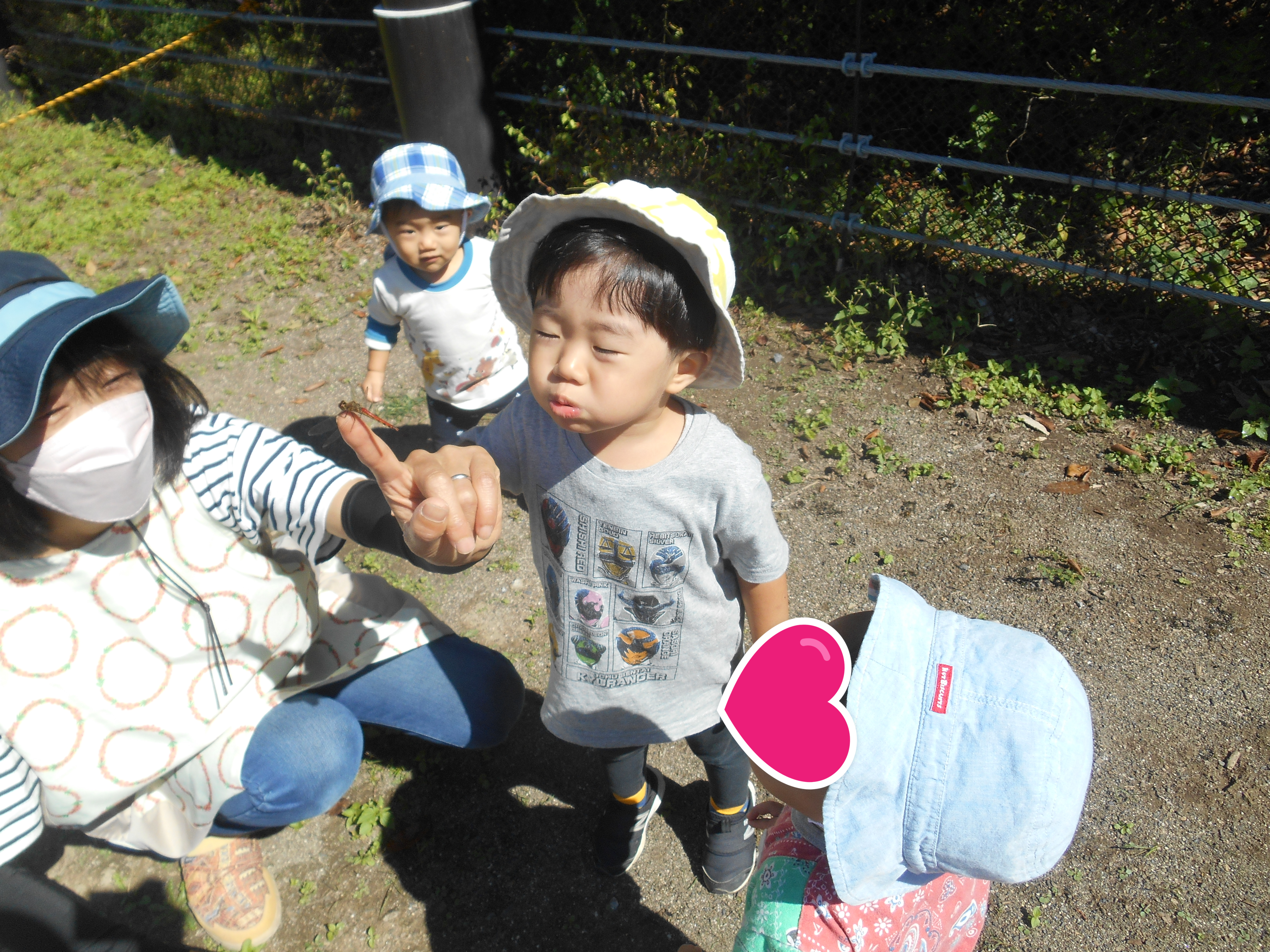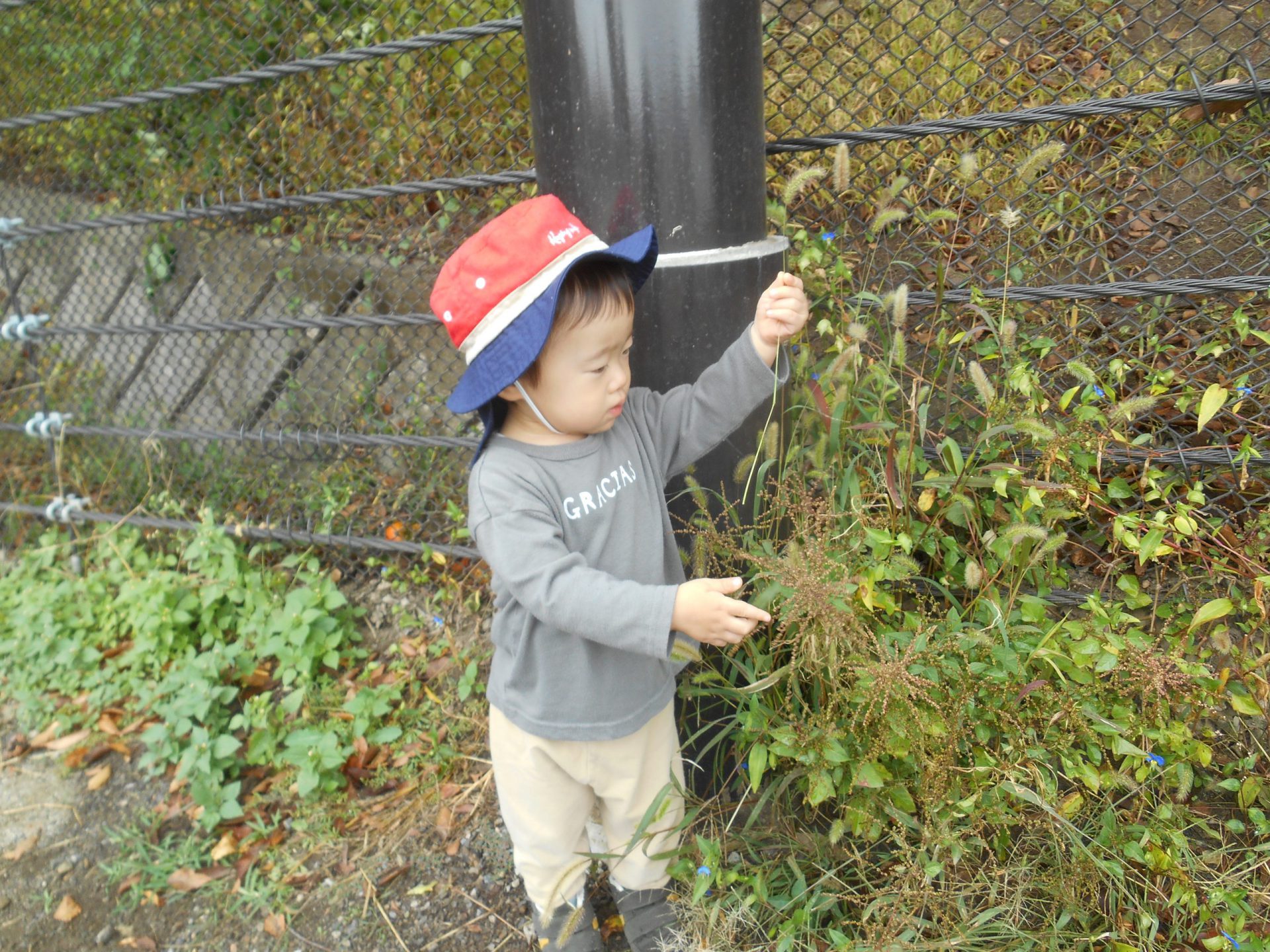 ねこじゃらしやバッタ、トンボ等、秋の身近な自然に触れる中で、少しずつ友だちと同じことをする楽しさや一緒に見たり触れたりする喜びも子どもたちの表情から感じられるようになってきました。