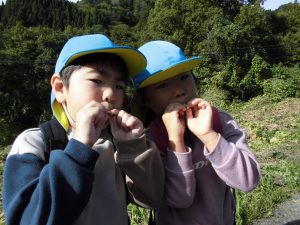 良い天気のもと草笛🍃を鳴らしたり、クルミやクリ、ススキなどの”秋”を探したりしながら歩きました!