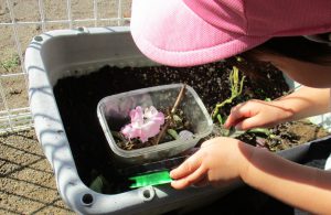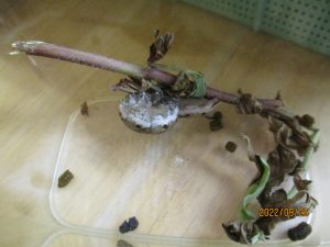 葉が少なくなって花が咲きづらくなりましたが、振り絞るように最後の大輪を咲かせてきてくれました。それを朝一に見つけた子が、ぷつっと採り、ケースに入れてずーっと様子を見ていました。