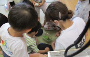 「エサはなにかな?」ととりあえず、保育士が周りにあったはっぱを入れてみると、子どもたちも真似していろんな葉っぱを見つけて入れてくれました。