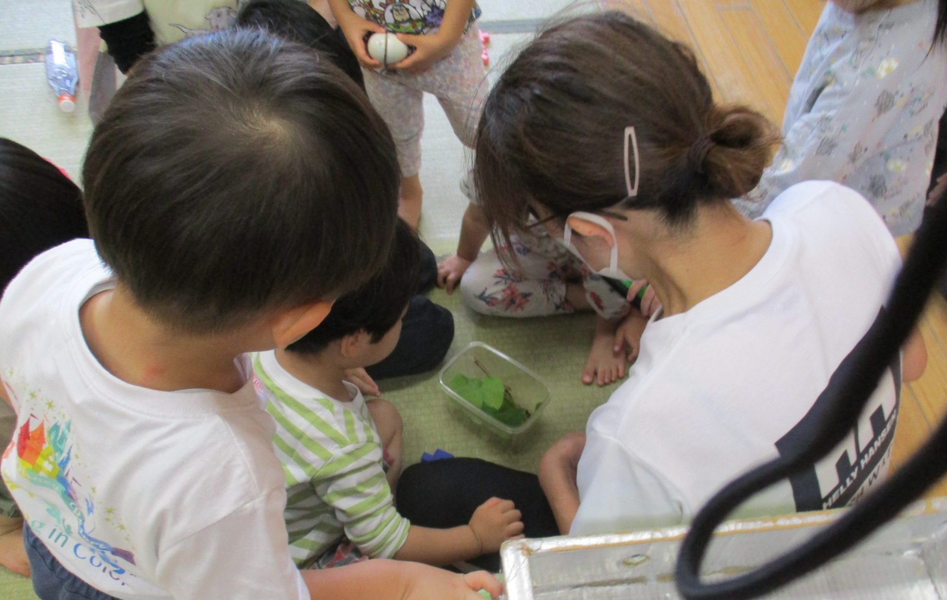 イモムシ=葉っぱというイメージが保育士にはあったため、子どもをなだめながらも、新しい発見がありました。