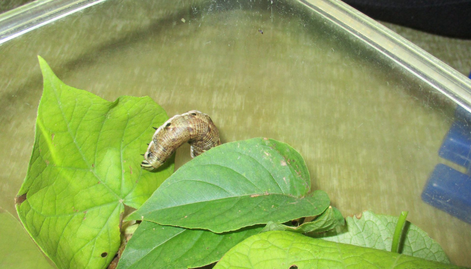大人の指よりも大きい角の生えているイモムシが現れました。