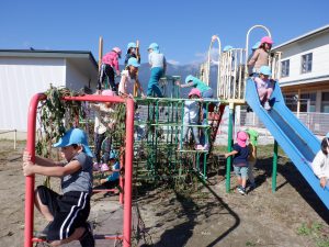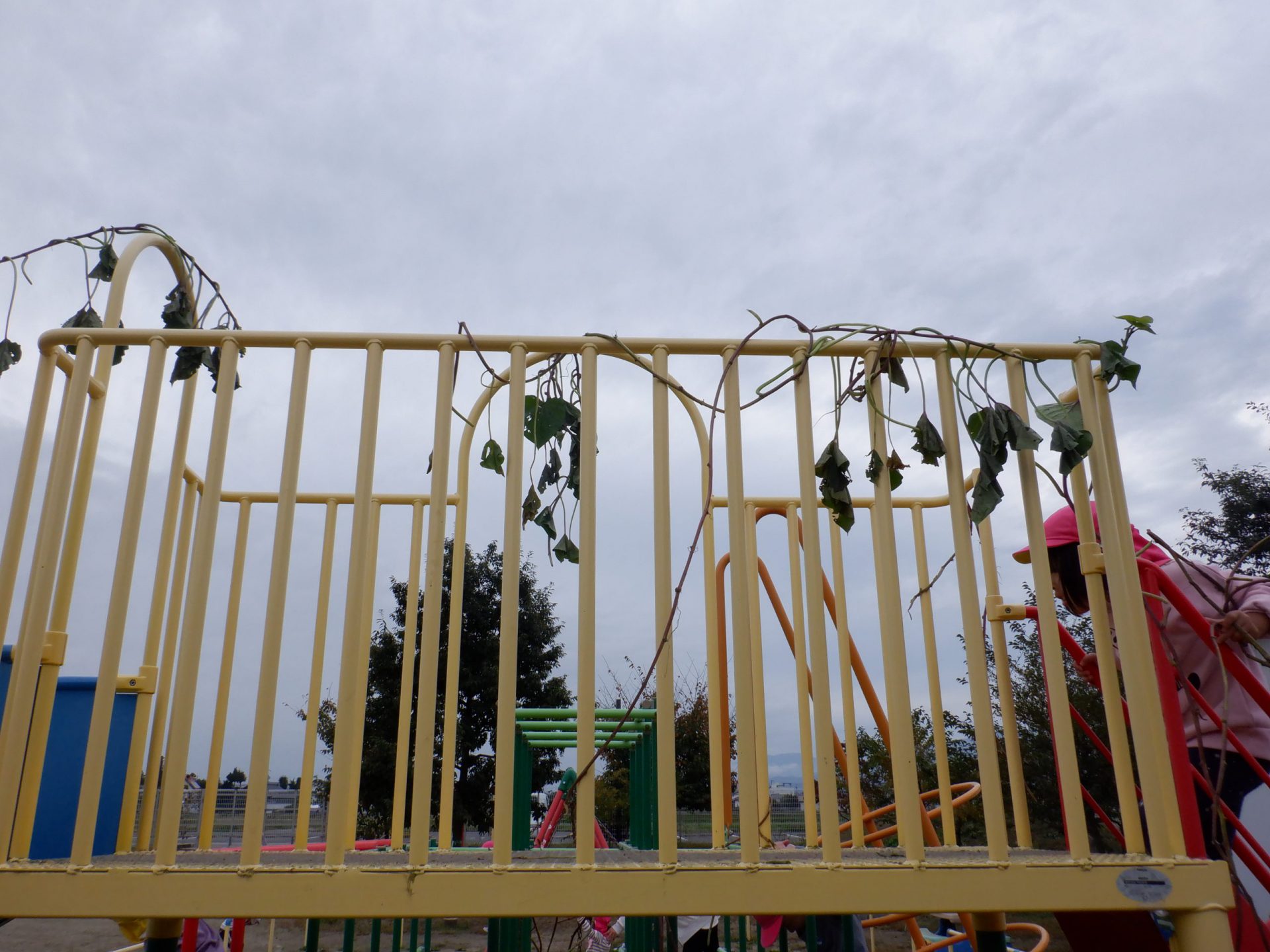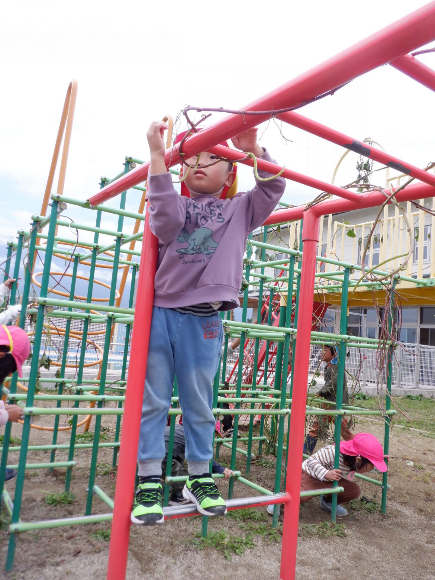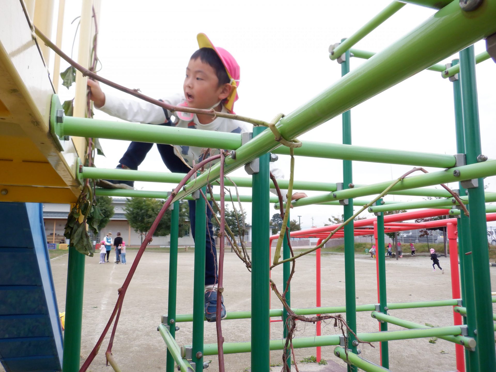 何やらジャングルジムに、つるがかかっています。年中さんがせっせとつるをかけています。