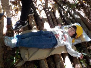 次の日「布団を作っておうちで寝たい!」と保育園で新聞紙と袋を使って作り、布団を持って里山へやってきました。