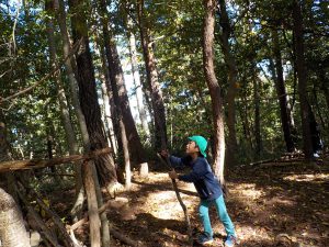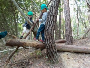 「家を作るんだ!」と年長さんが里山に豊富にある木から家作りに使えそうな物を選んで運んできました。