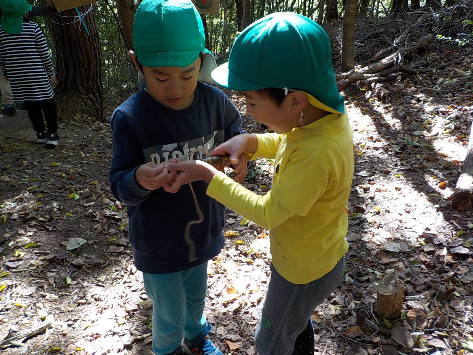木の棒にひもを結んで釣り竿を作りたいA君。なかなかうまく結べません。それを見たB君が「こうやってやればいいんだよ。」と教えてくれました。「あぁ~、そうやってやるんだぁ!」「すご~い‼」とA君。