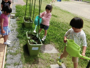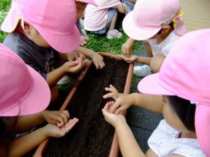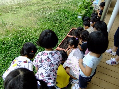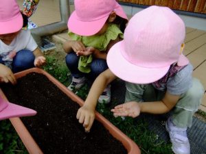 5歳児さん達が二十日大根やさつまいもを畑で育てている様子を見て、自分たちも野菜を育ててみたいとなりました。
