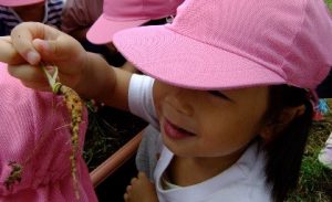 ・3歳児は小さな種からにんじんの葉っぱが出てきたり、土の中に野菜が実ることに気付きました。