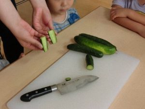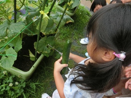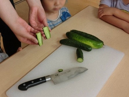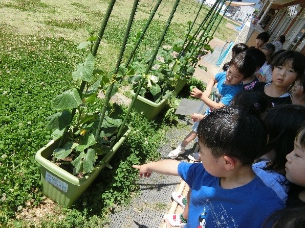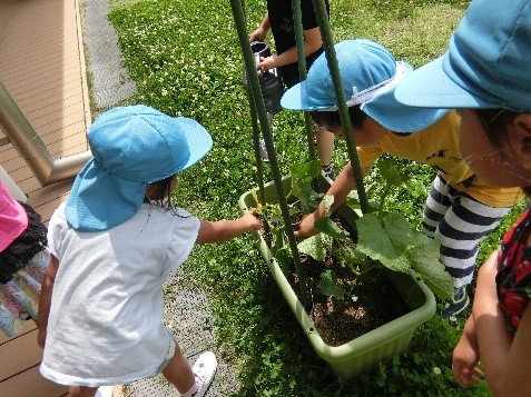 ・4歳児はきゅうりが、苗から花が咲き、そこにきゅうりが実ることに気付きました。また、きゅうりのにおいや種がなかにあることにも気付きました。