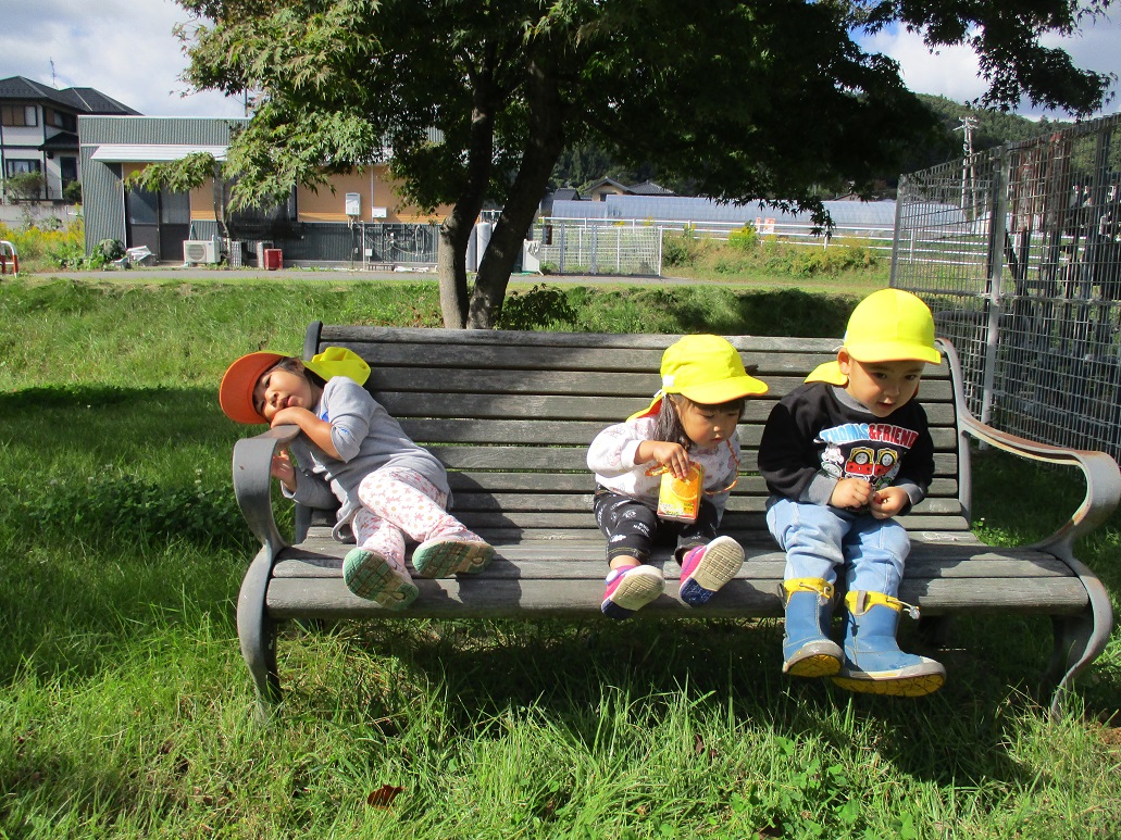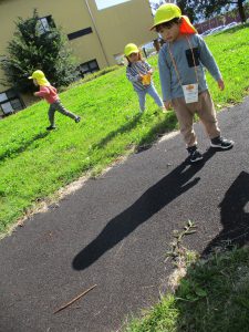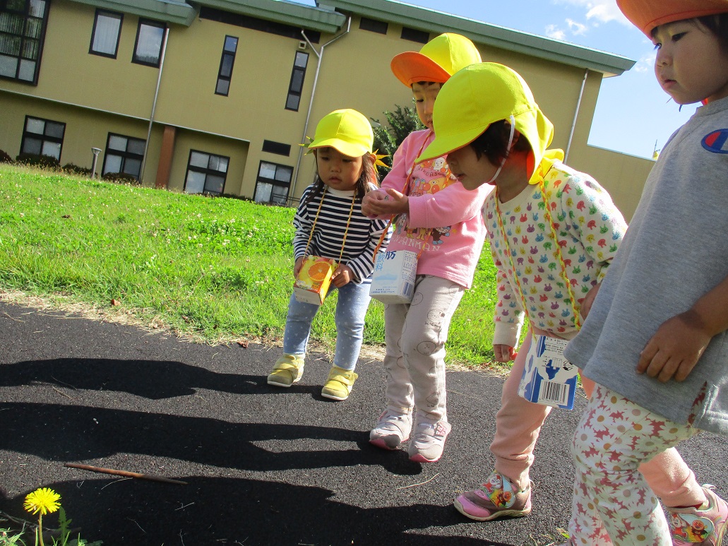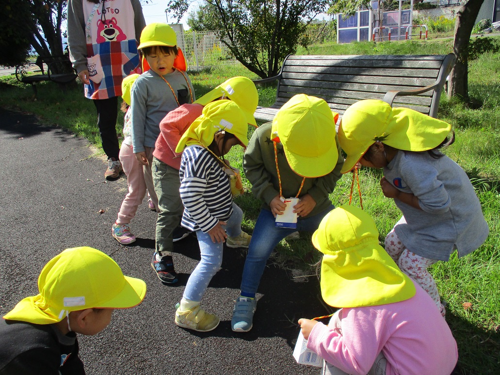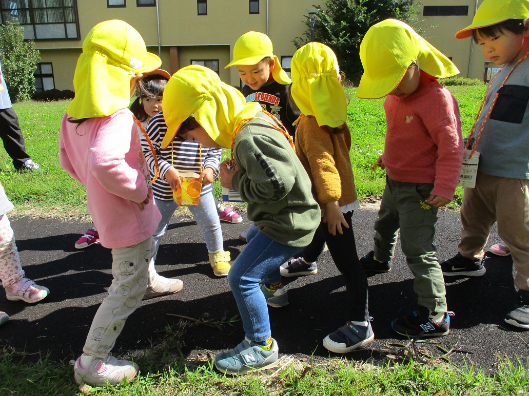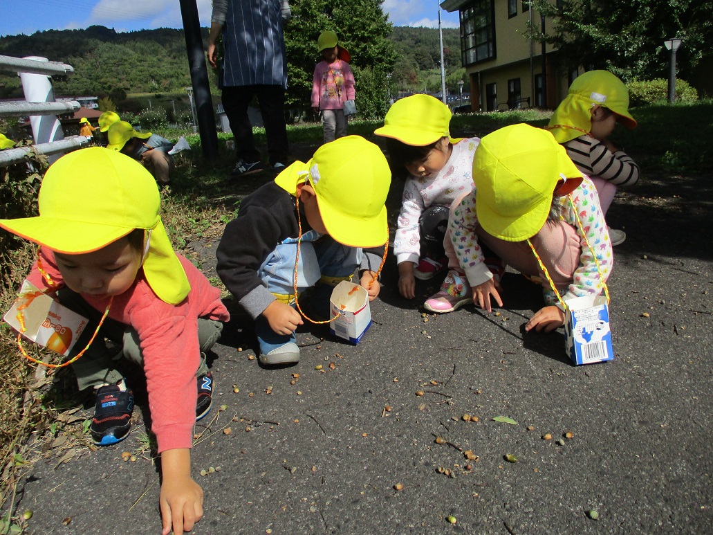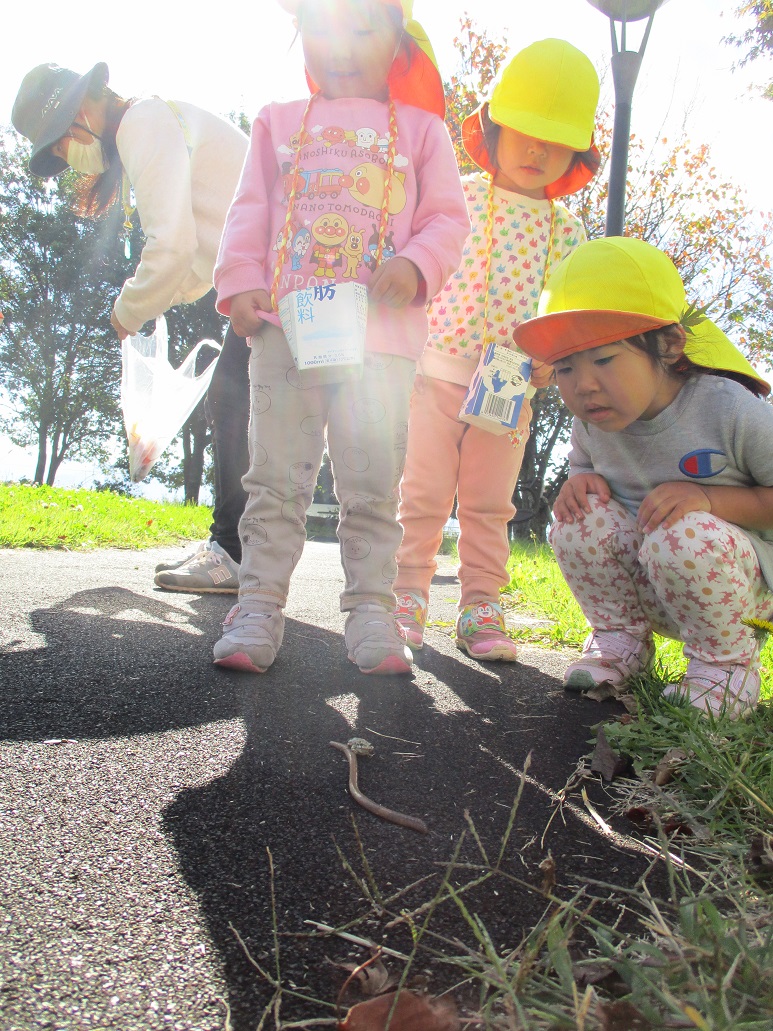 どんぐりや紅葉の葉っぱを拾ったり、ミミズやちょうちょやカエルを見つけたり、思い思いの遊びを楽しんでいました。