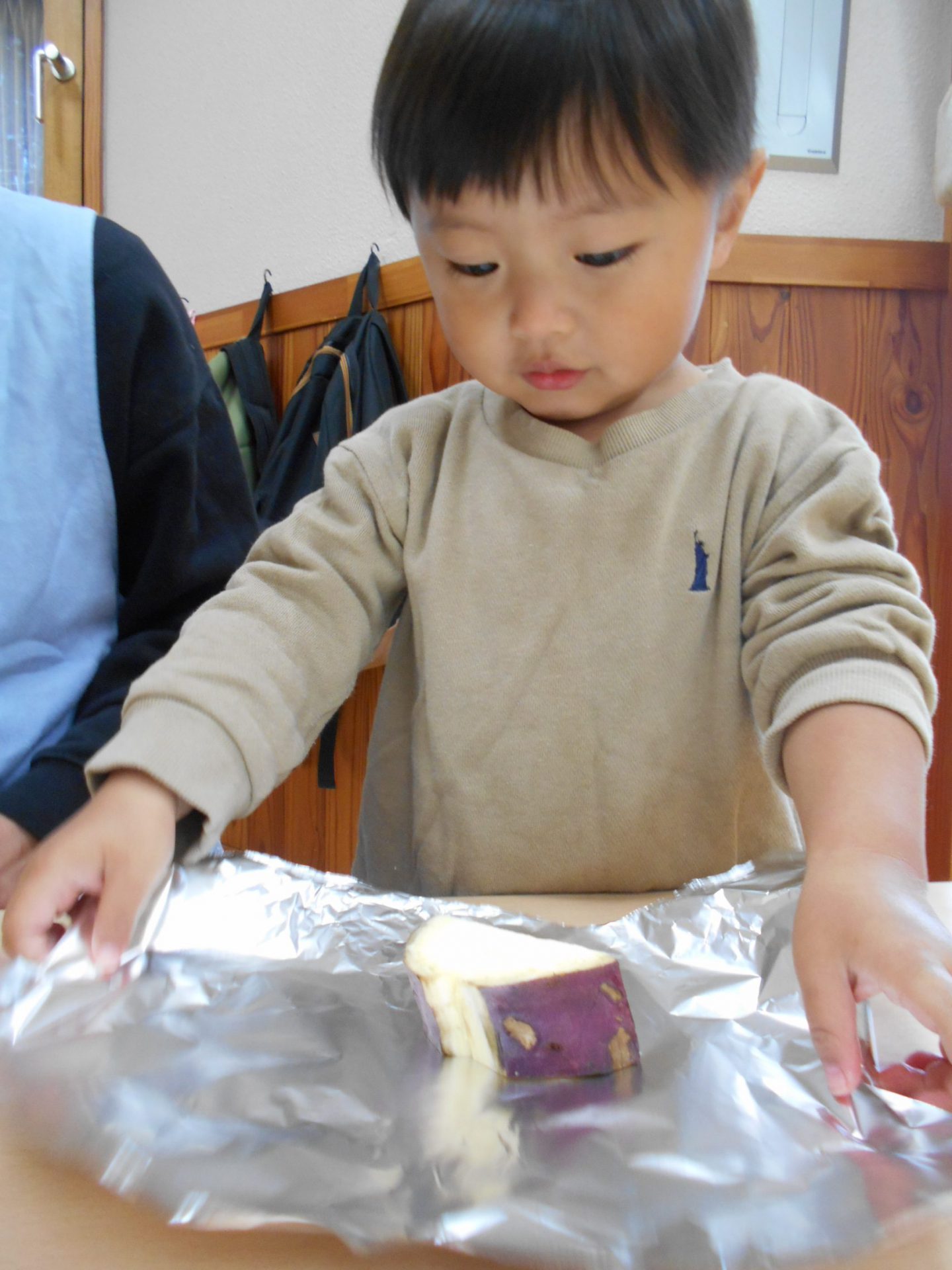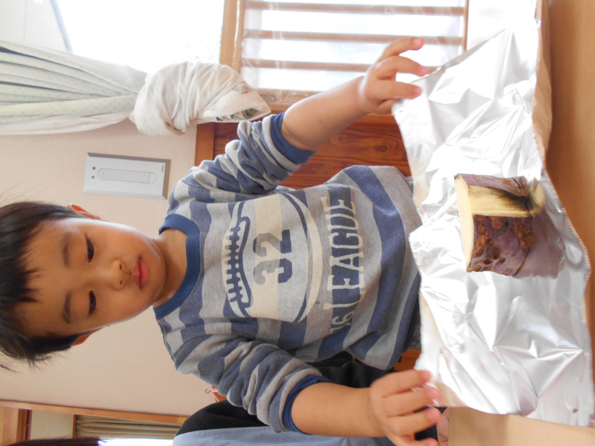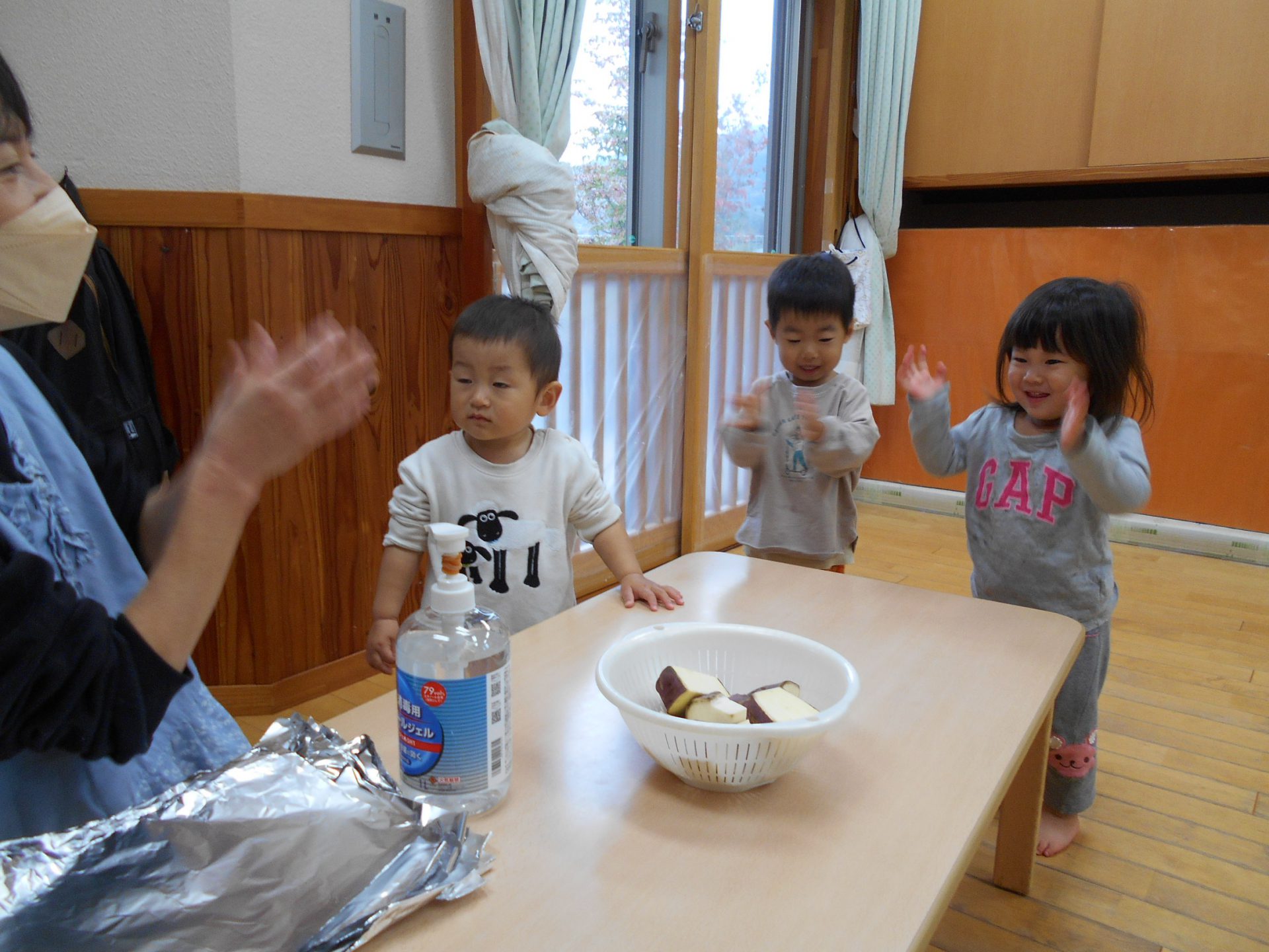 『やきいもグーチーパー』の手遊びを歌って、芋をアルミホイルで包みました。