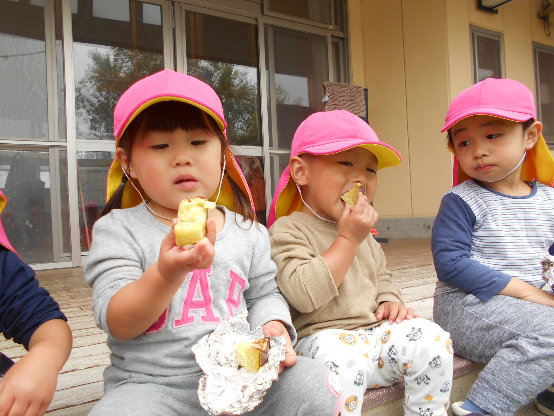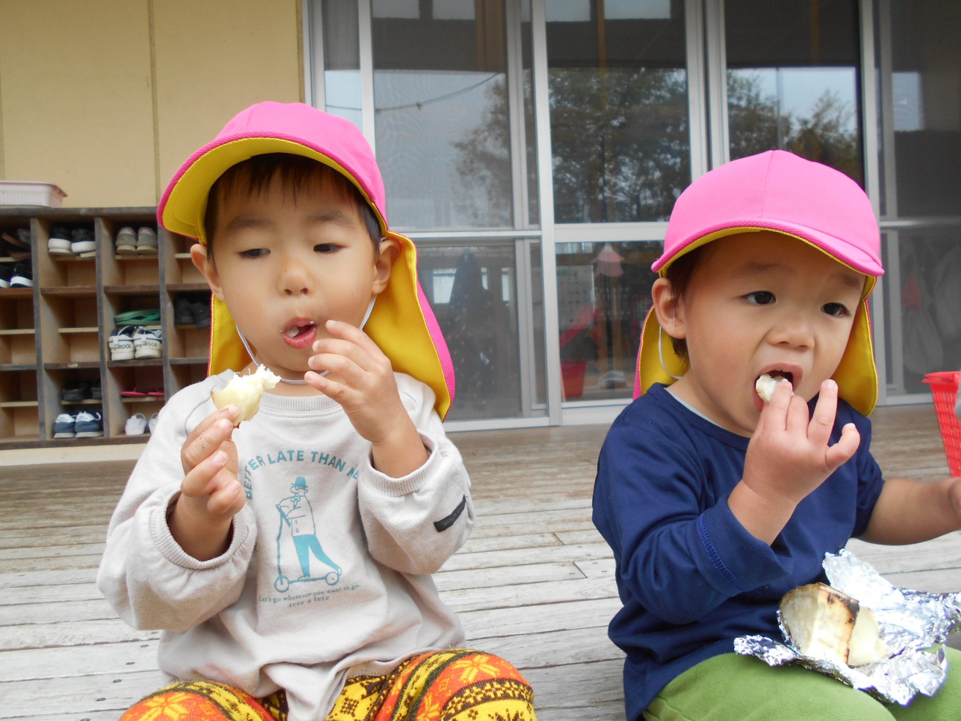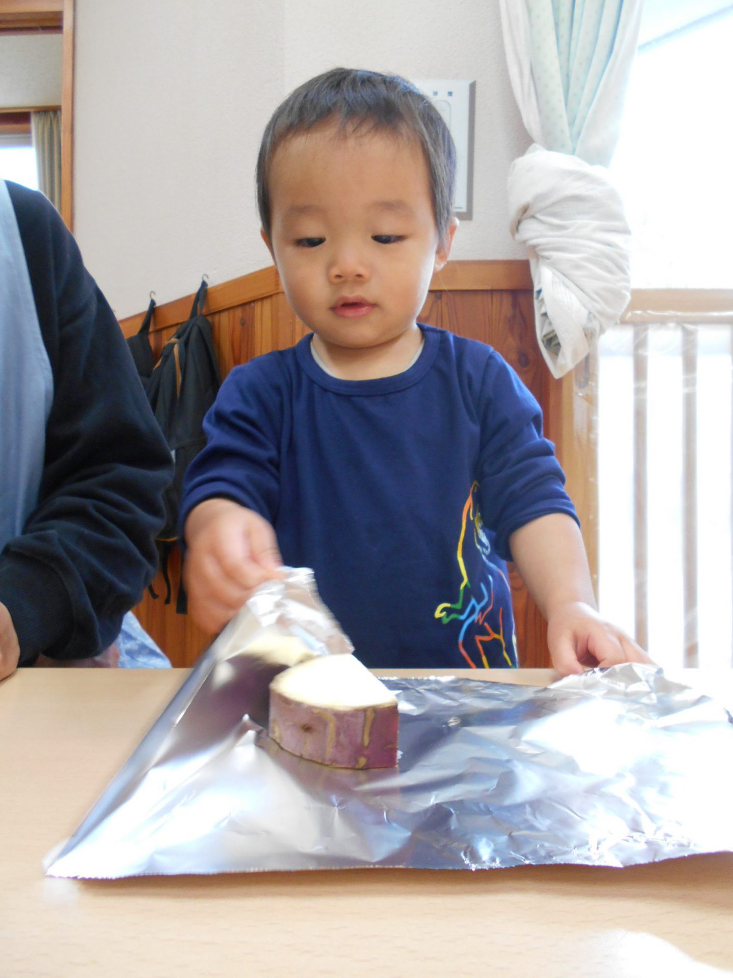 『やきいもグーチーパー』の手遊びを歌って、芋をアルミホイルで包みました。