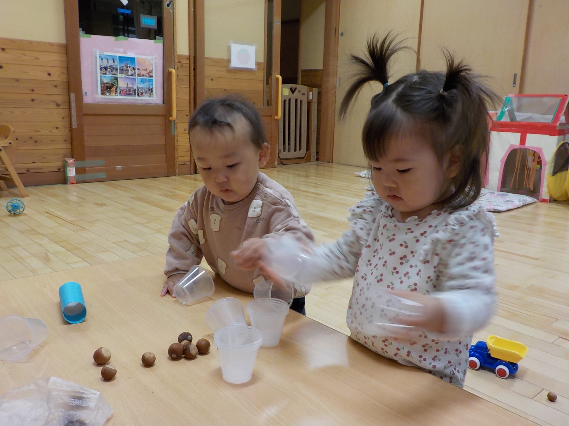「ぽちょん ぽちょん」と言いながら、カップにいれて音を楽しんで遊びました。