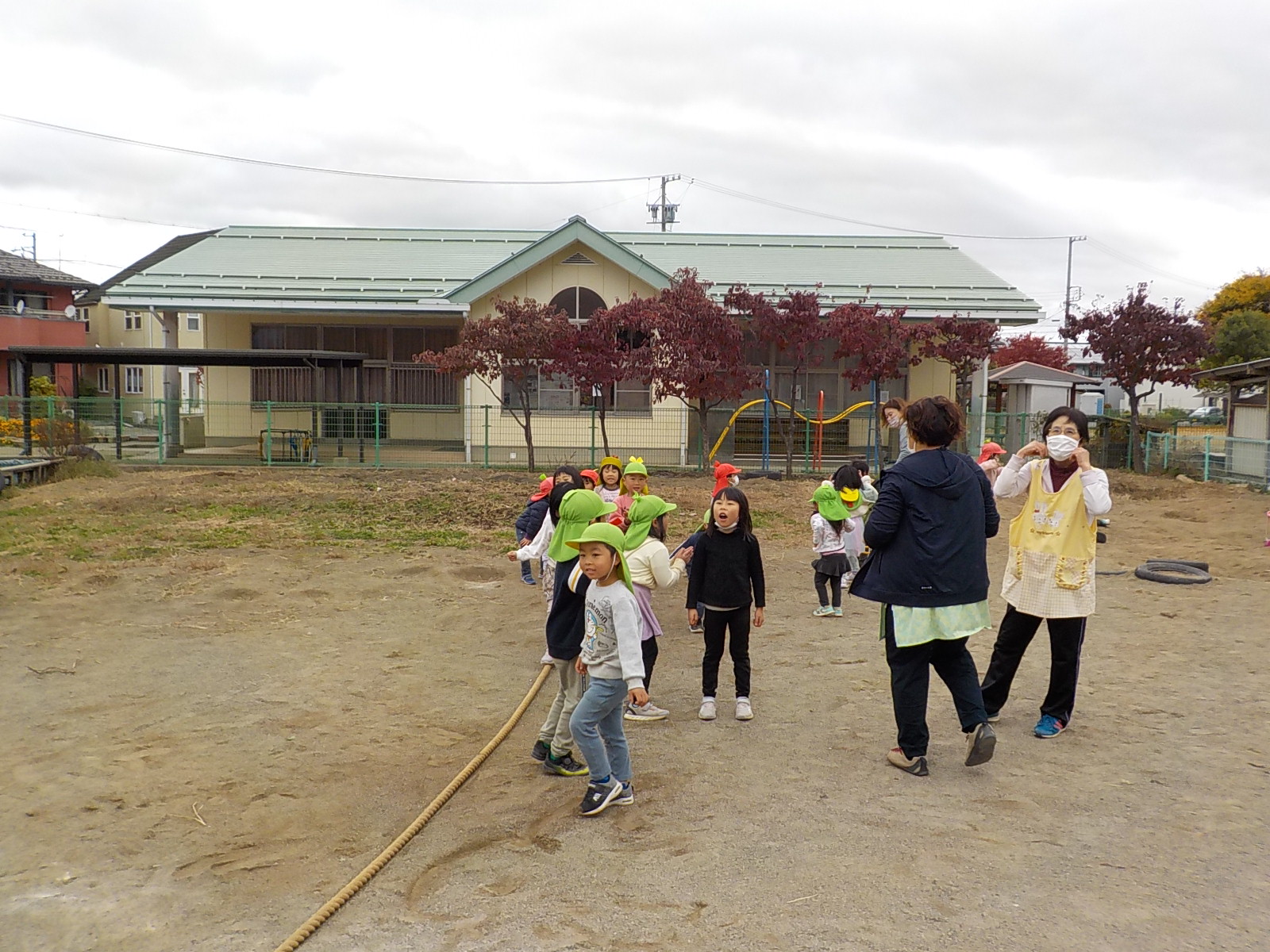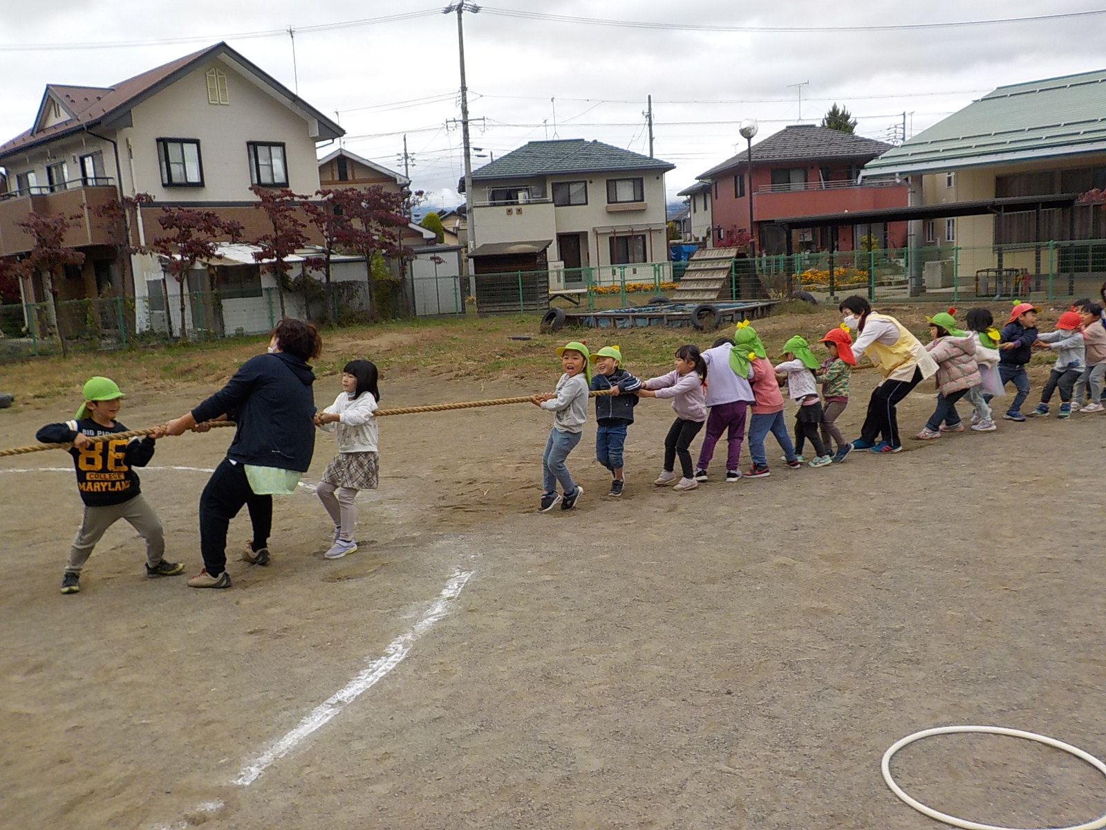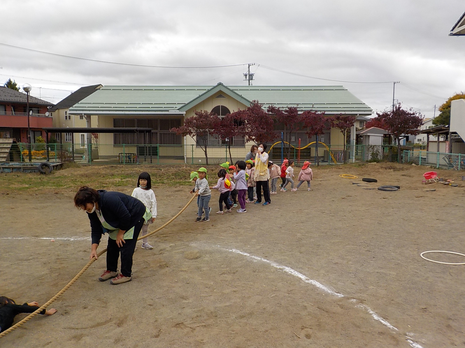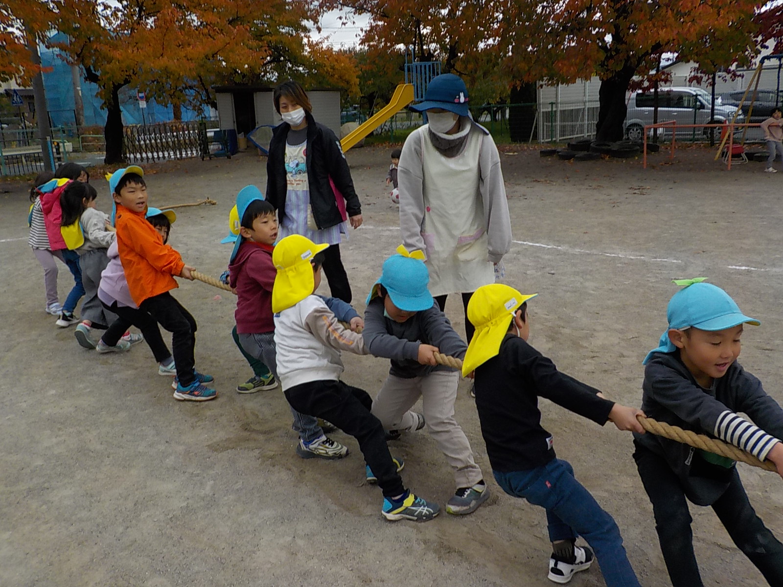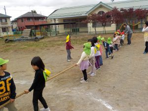 ここ最近出番がなかった綱。倉庫から出すと「何それ?」「小学校の運動会でやっていたよ」など、いろいな反応を見せる子ども達。自然と2つのチームに分かれて、綱引き大会がスタートです。