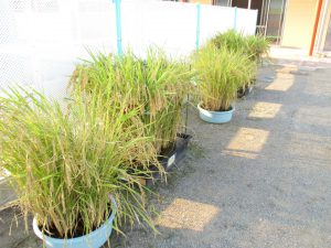 秋になると穂が付き頭を垂れる程に生長しました。そうなるとタライの水はひたひたにするのではなく、1回なくしてから継ぎ足していくようにすると良いと教えていただきました。