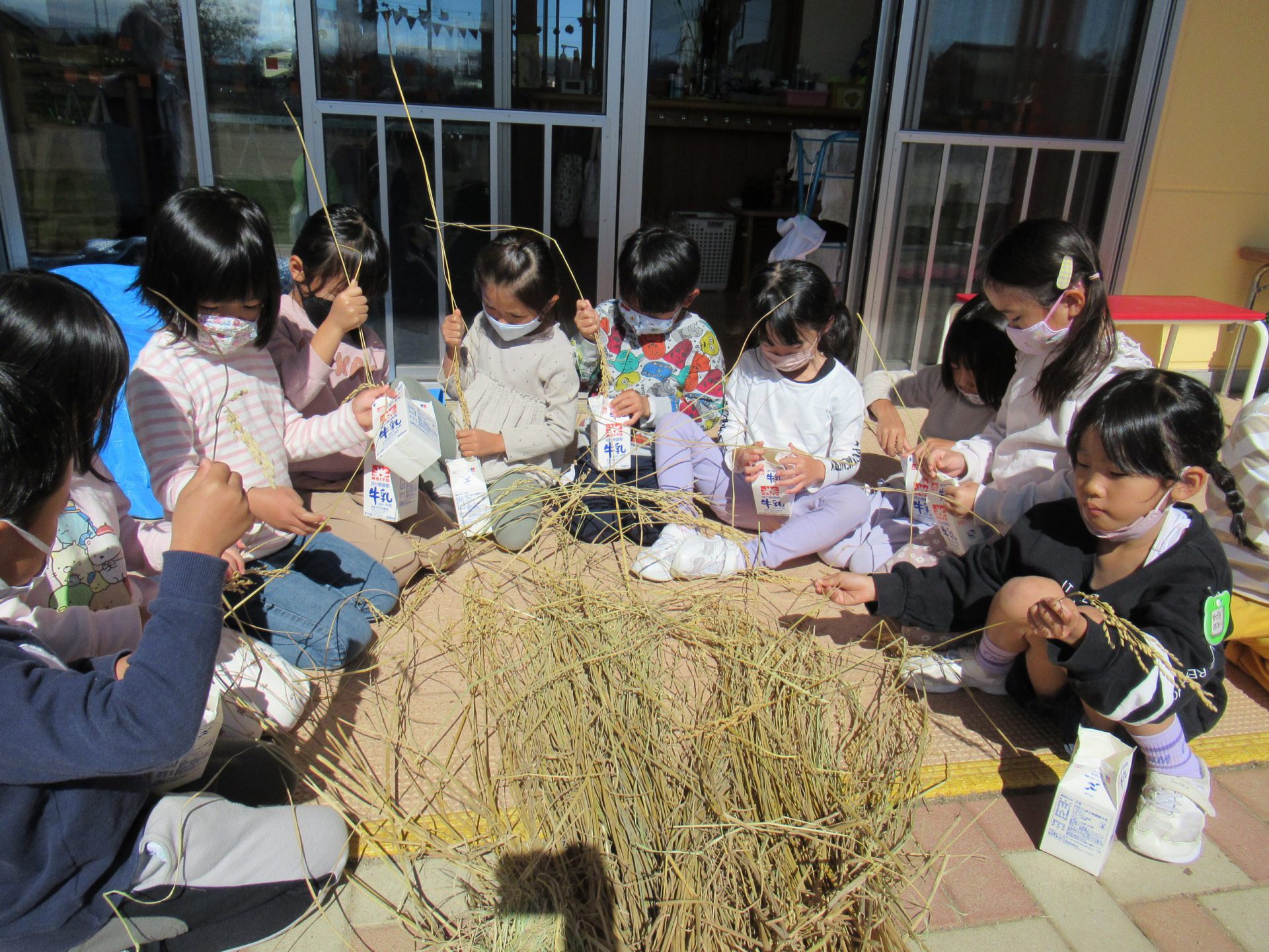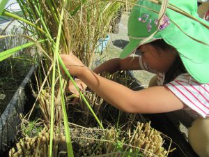 お米を育て始めて、稲の成長を身近で感じてきた年長さん。簡単には育たないことや、手間がかかっていることを感じたと思います。だからこそ、お米ひと粒ひと粒の大切さや、ありがたさがわかったのではないかと思います。