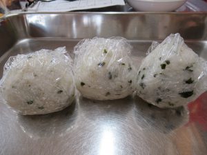 お散歩をした日の給食に、年長さんにと給食の先生がおにぎりを作ってくれました。