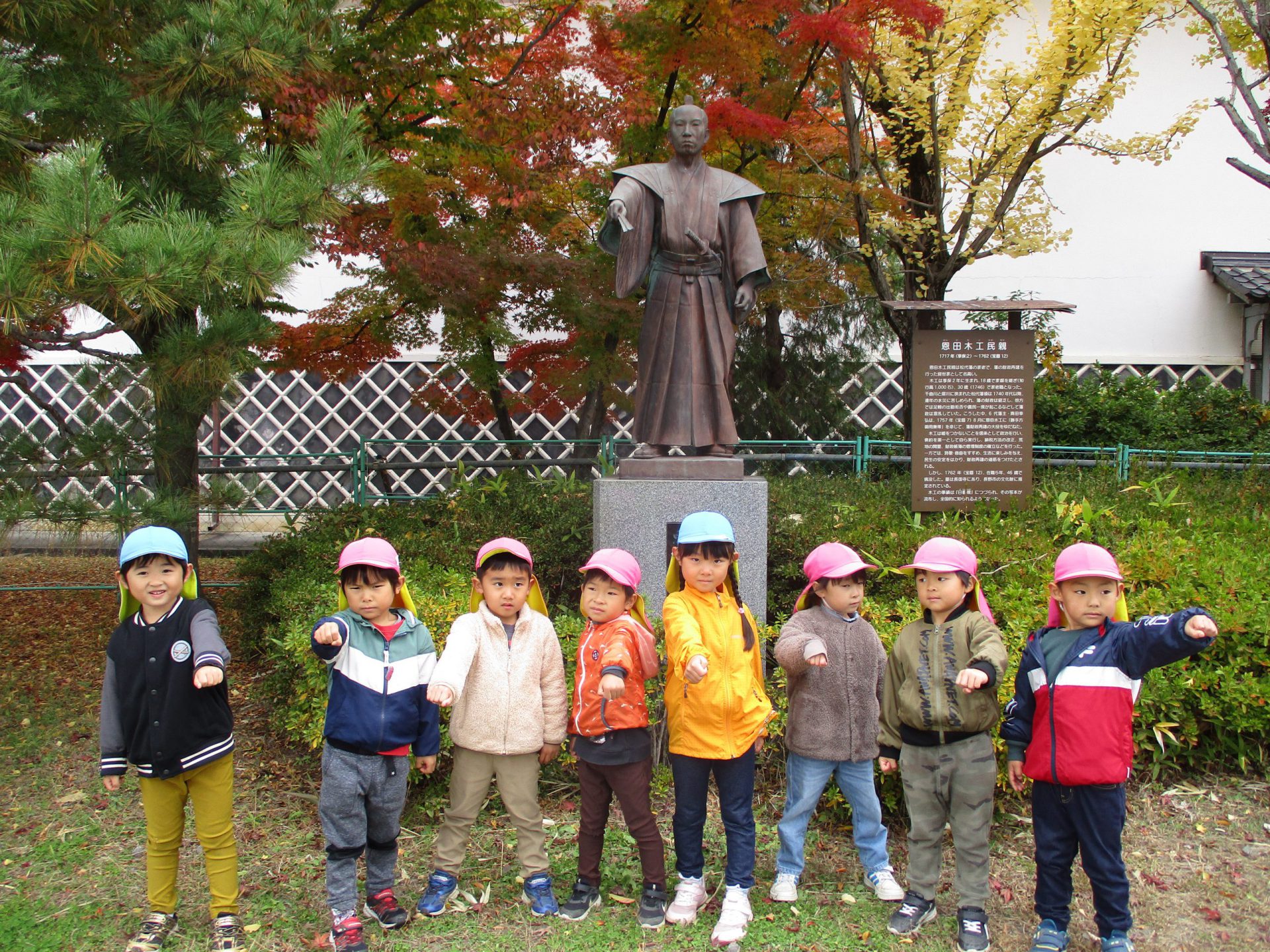 恩田木工さんの銅像の真似 「このポーズ、かっこいいね」