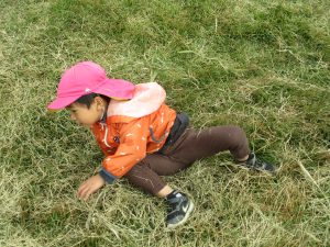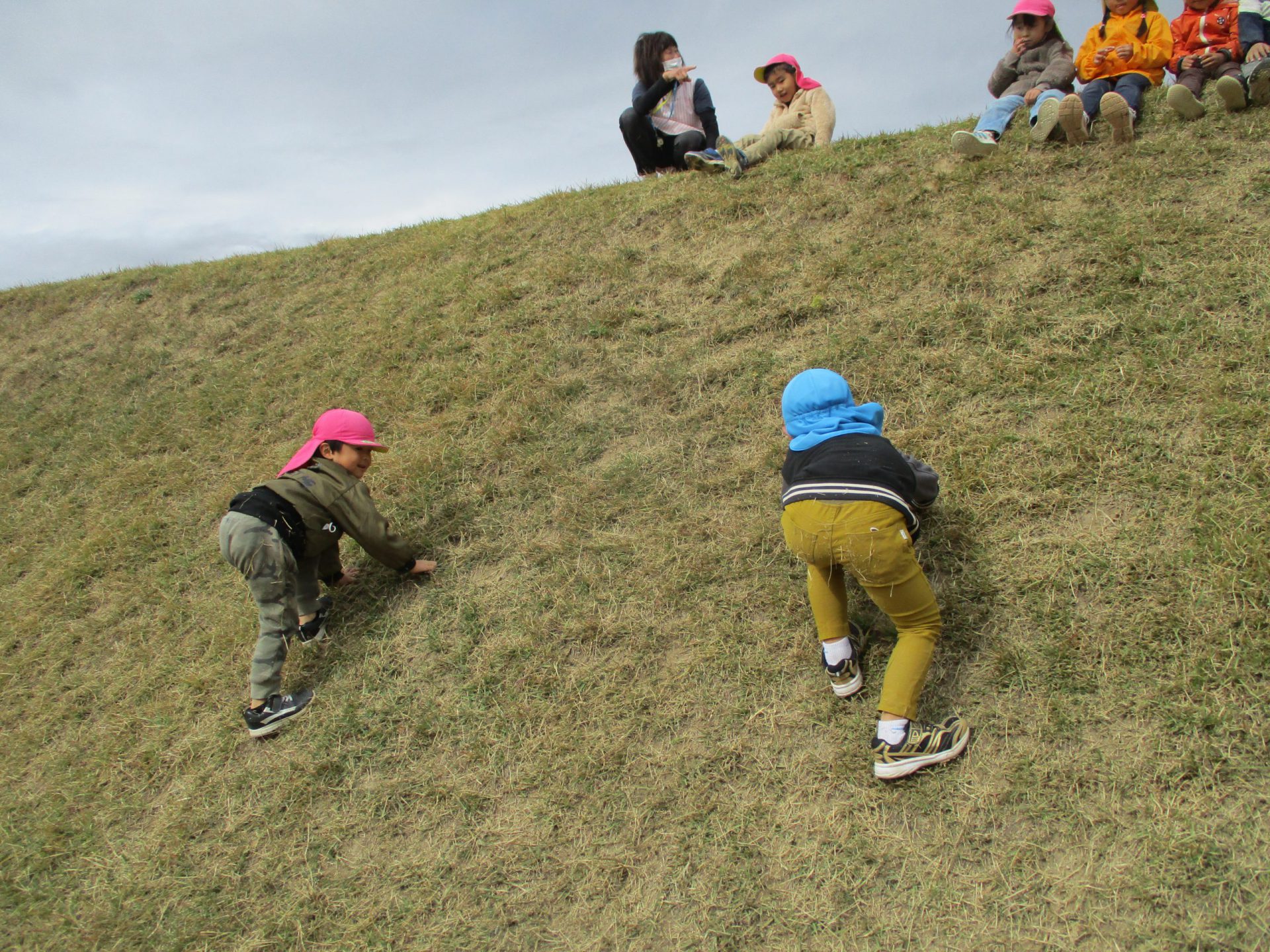 四肢を使って登ります。滑っても滑っても、何度も登る子ども達。