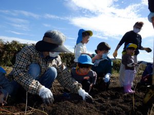 祖父母参観で、おじいちゃんおばあちゃんと芋掘りをしました。