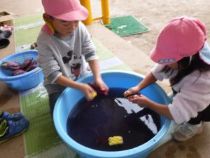 サツマイモを洗ったら水が紫色になったと発見。一生懸命に土を落としてくれました。