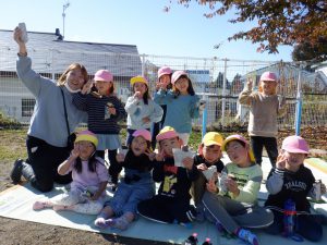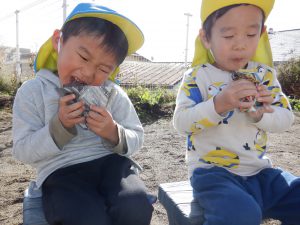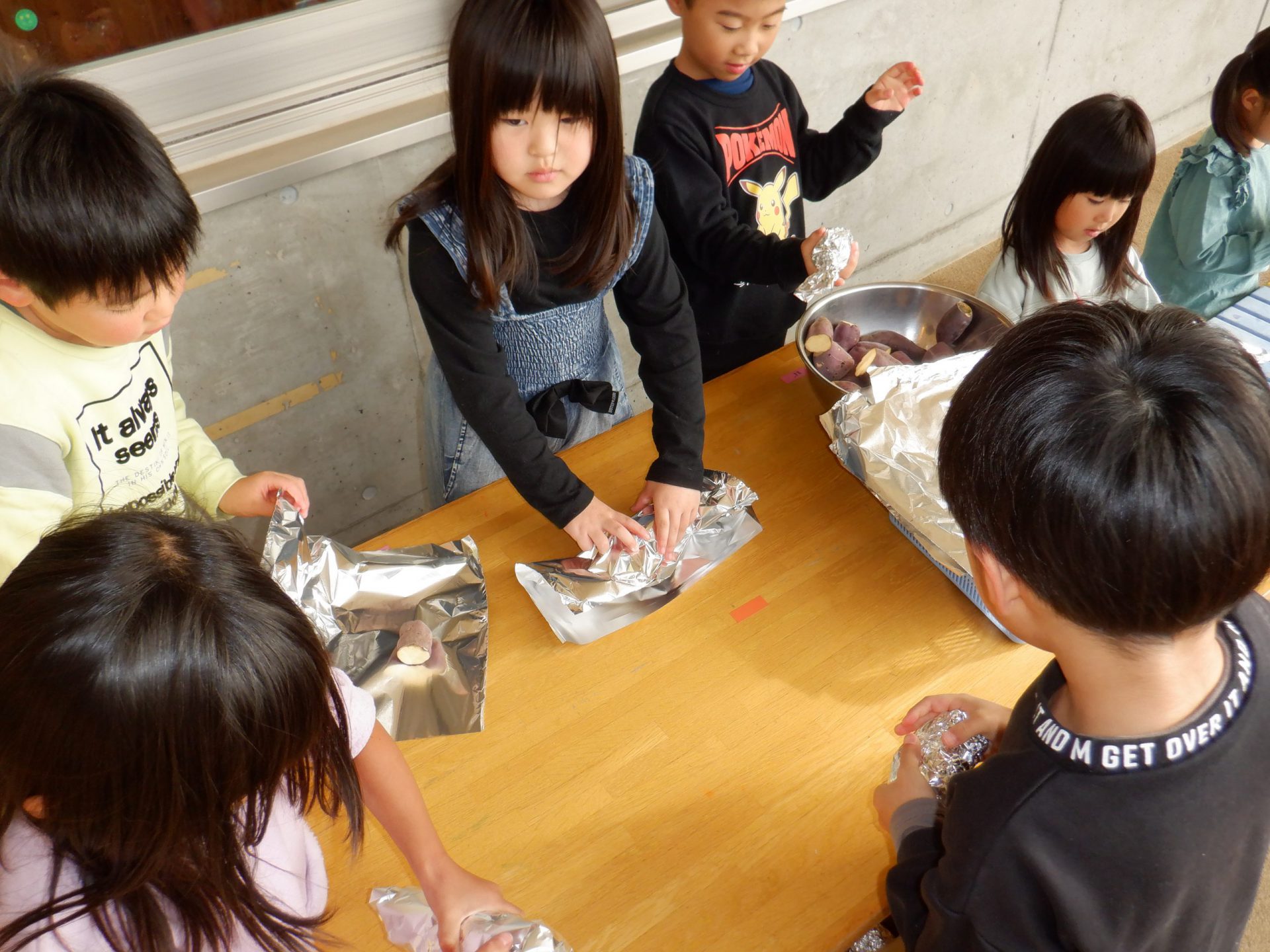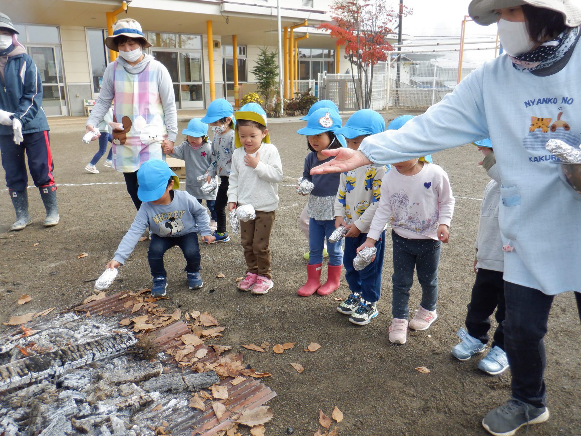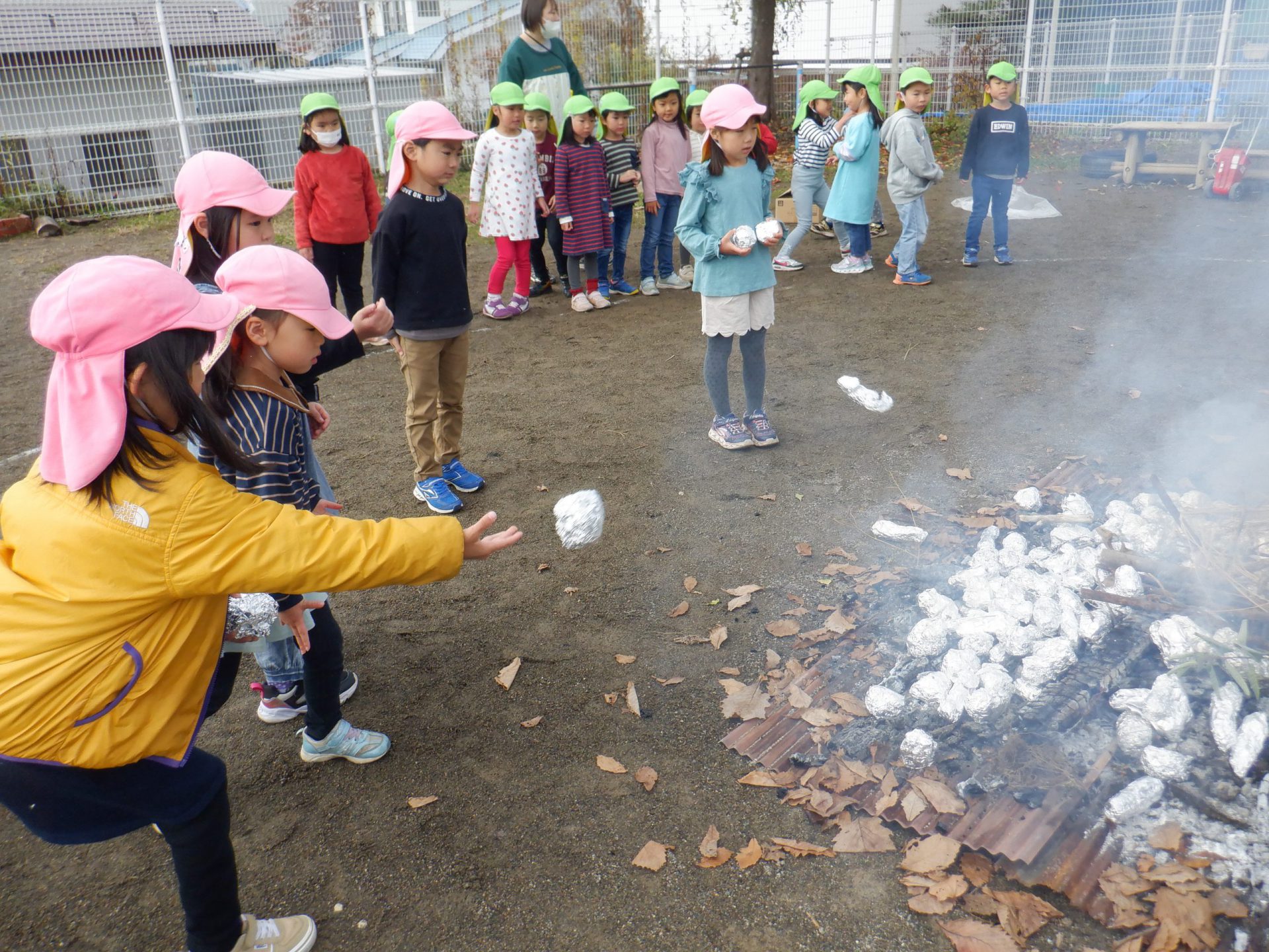 アツアツのお芋をいただきました。「おいし~!」「あつい!」「おかわりあるの?」みんな大喜びの焼き芋会になりました。