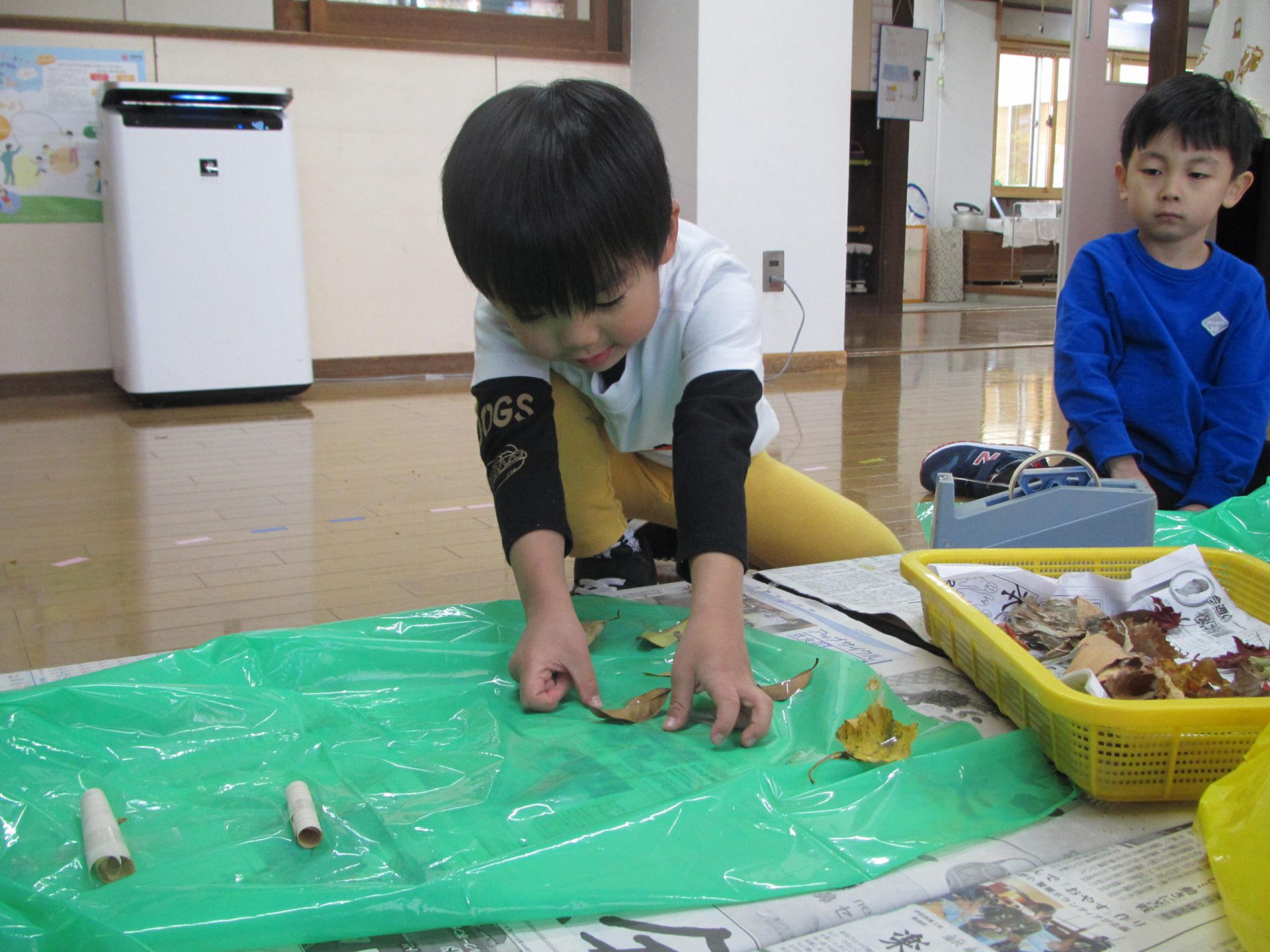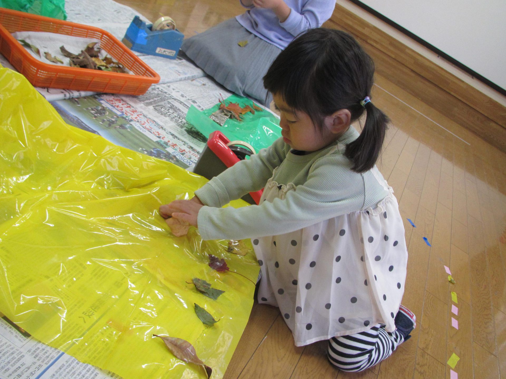 思い思いに葉っぱを貼って・・・。 かわいいマント出来るかな・・・。