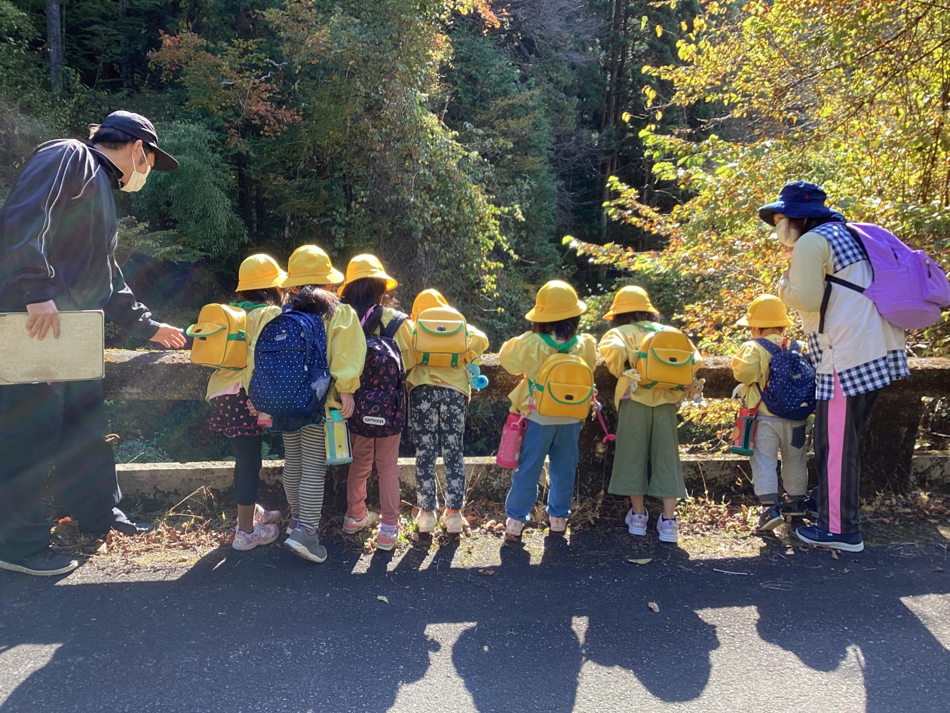 ・つたの滝近くの橋から川を覗き込んで、「川の水が白くて泡になってるよ」と勢いある川の流れに違いを感じる子ども達。