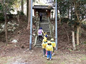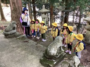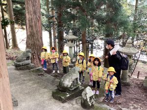 保育士から神社のお参りの仕方を教わり、みんなで一緒にお参りをします。
