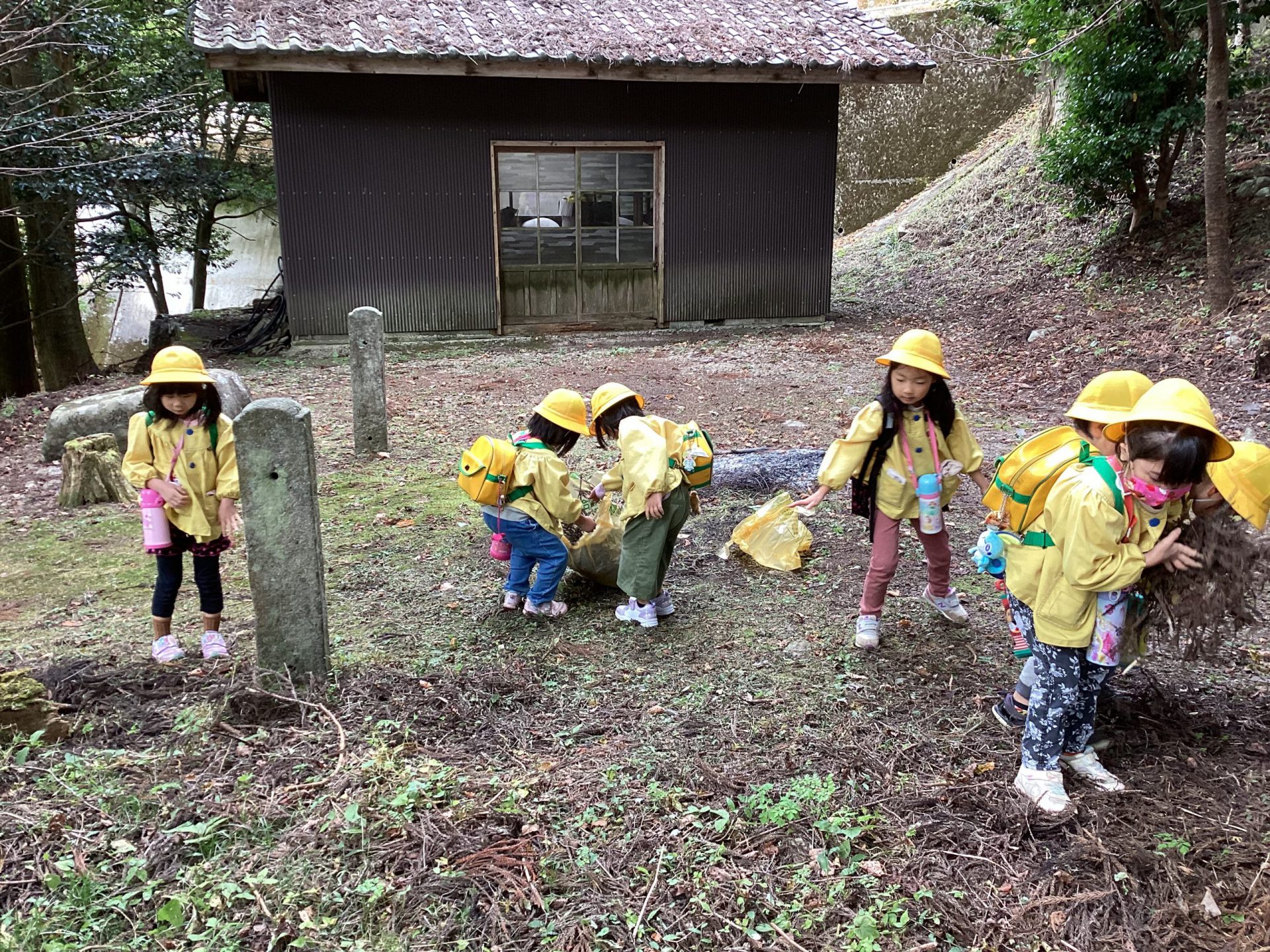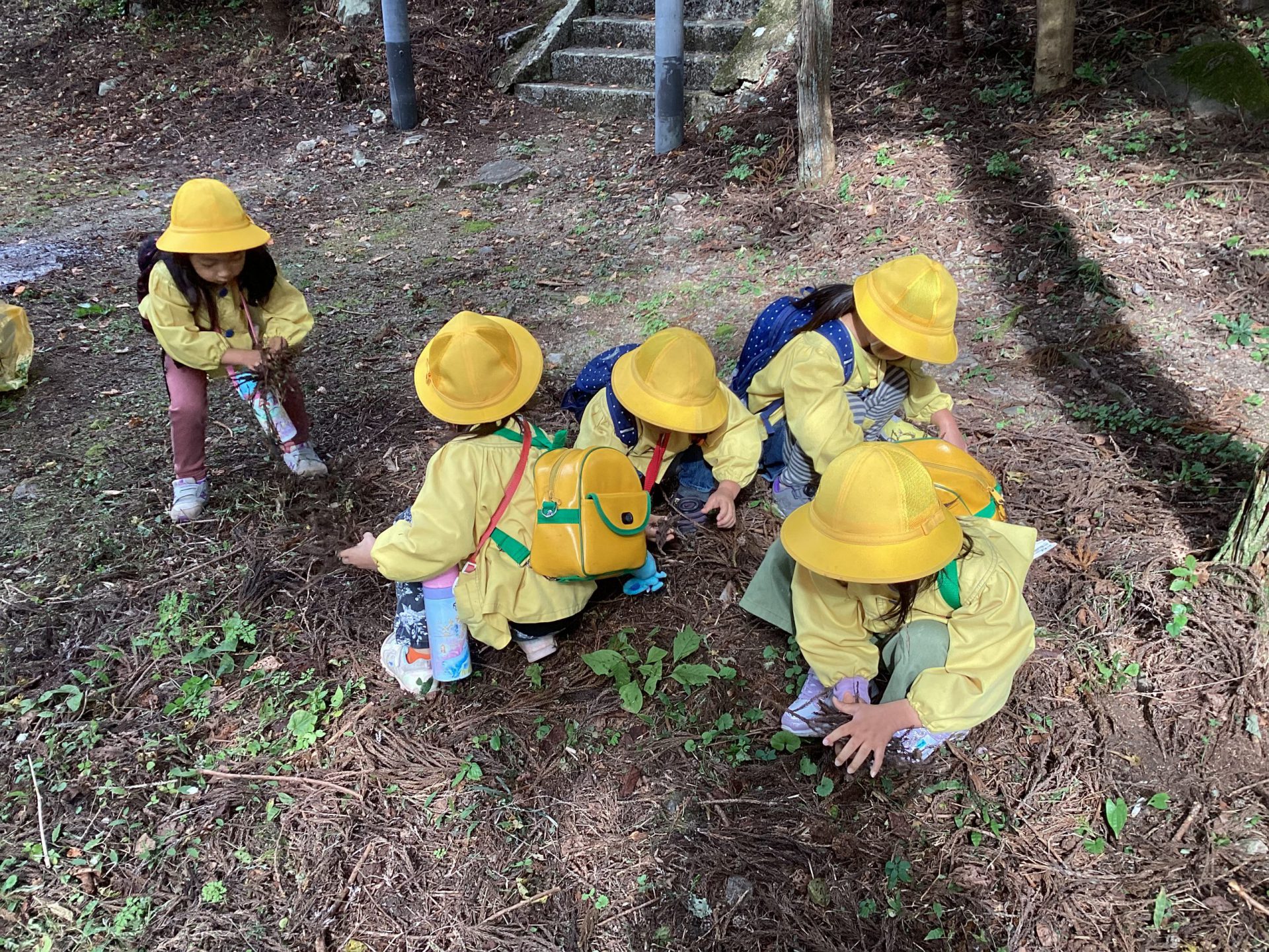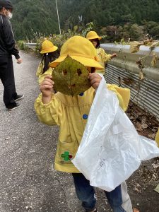 神社の石段の下の広場には杉の葉がたくさん落ちていました。「今度、焼き芋あるから、焚き付け用に集めよう!」という事で、用意をしたゴミ袋がいっぱいになるように集めます。