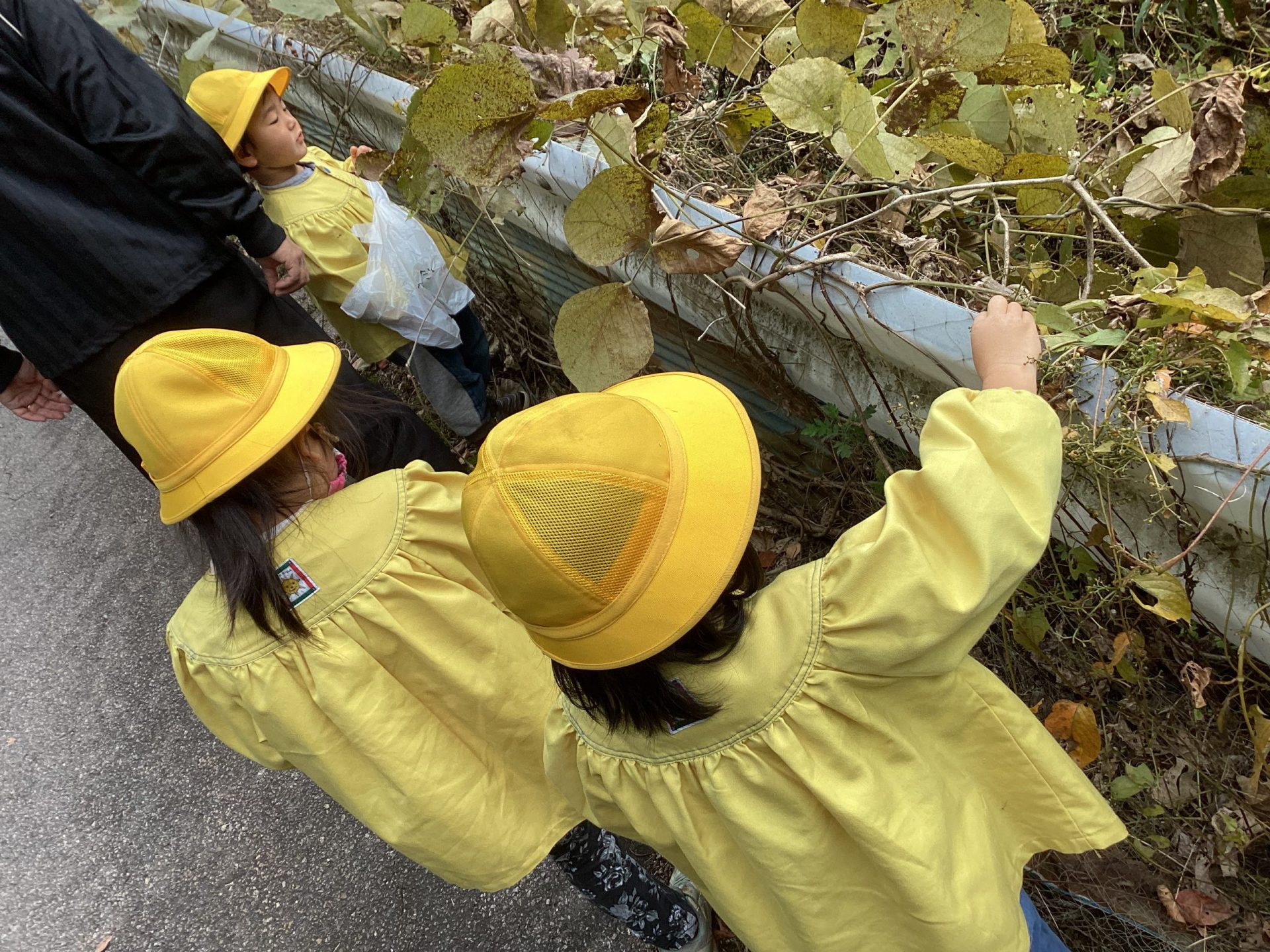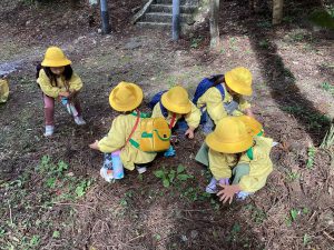 ・枯葉の中から虫の声。「何の虫だろう?」と聞かれ、「コウロギ」「すずむし」と答える中、保育士が歌う ♪虫の声 をヒントに「まつむし」と答え、保育所で歌っている成果が見られ、その後、虫の声を歌いながら歩く子ども達。
