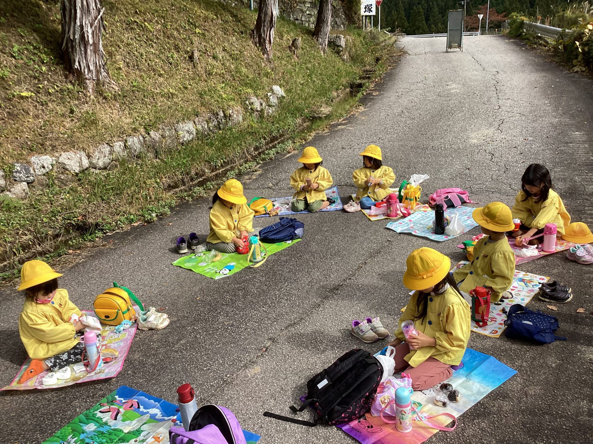 信玄塚の近くでお弁当タイム。「お弁当が楽しみ!!」と言って歩いておなかがすいた子どもたちは待ちきれないようでした。工事で通行止めになっている場所で敷物を広げて「いただきます」