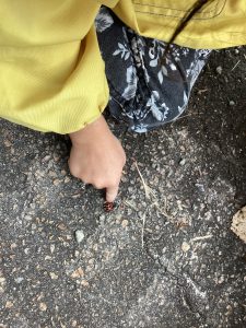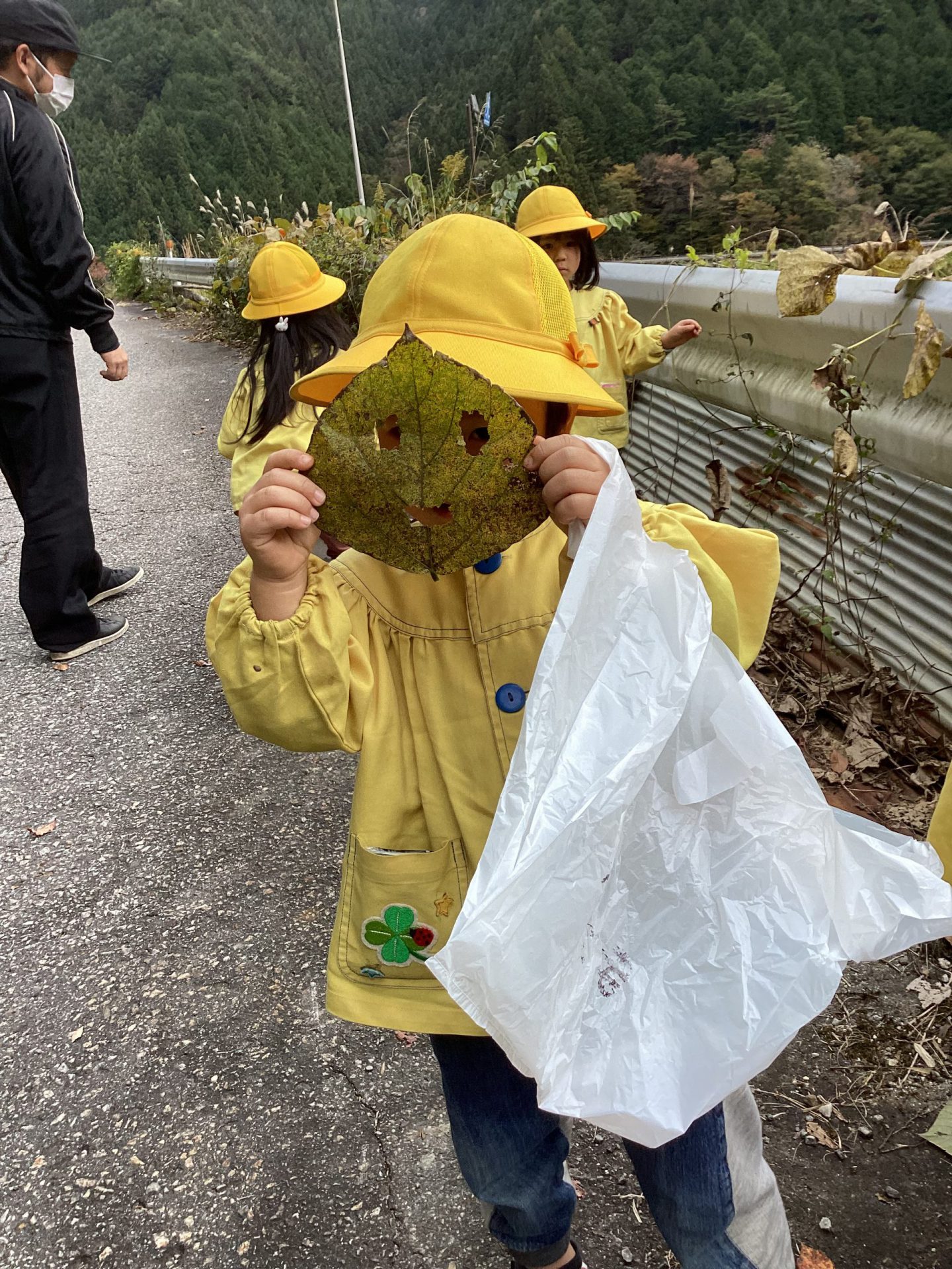 食後は近くで散策。大きな葉っぱに穴をあけてお面にしたり、見たことのない大きさのてんとう虫を見つけて大騒ぎ。草花を摘んでお土産にしました。