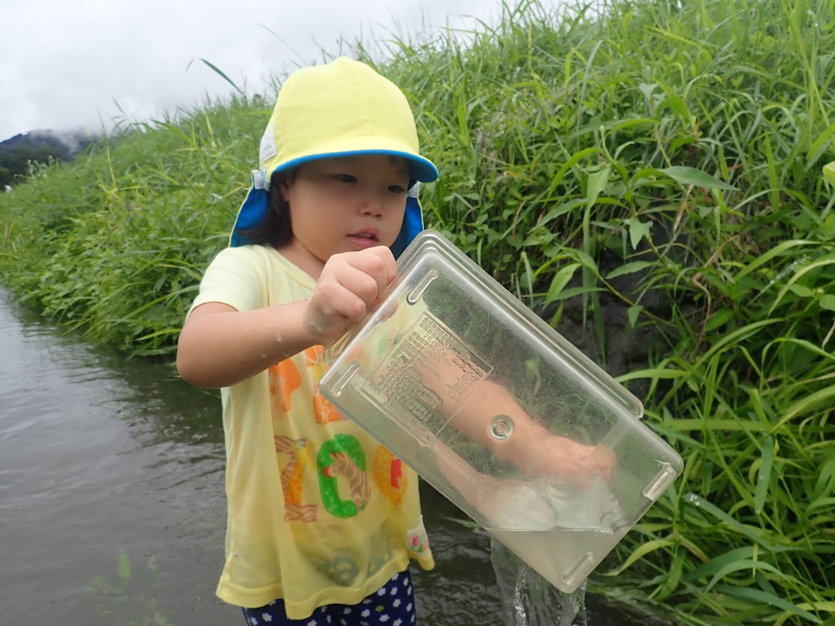 そら組は今シーズン3回目の川遊び。探検を終えると早速、生き物探しを始めました。生き物が生息している所を知っていてクレソンの生えた水の中に網を入れると小さな水生生物がすぐに見つかりました。飼育ケースに入れ、川岸に川の水族館を作り、みんなで観察しました。