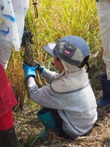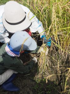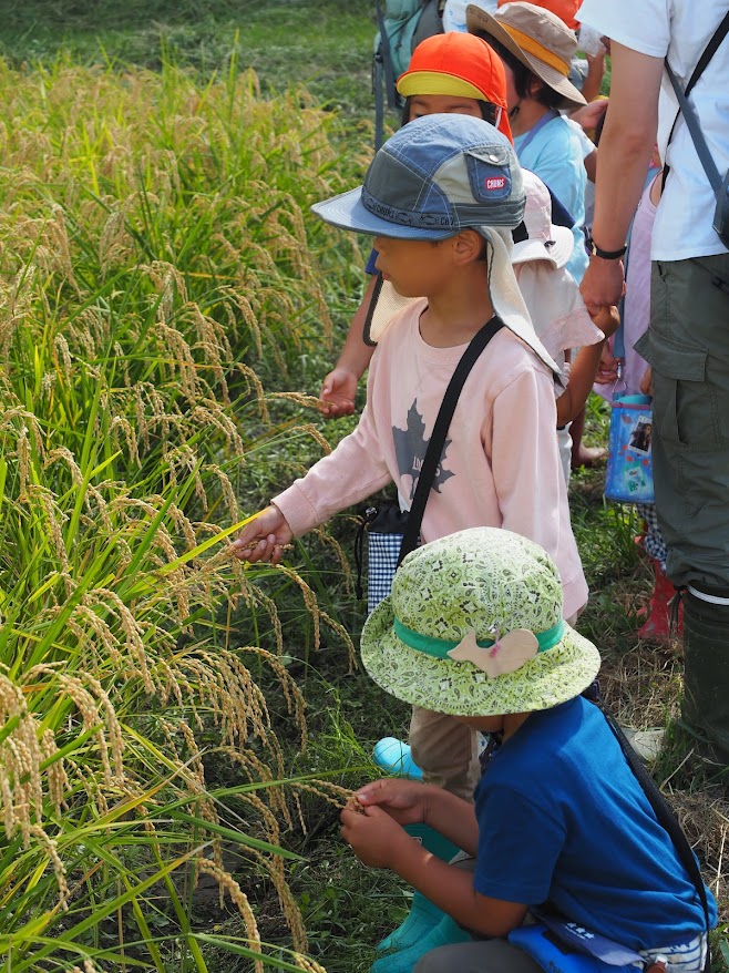 田んぼの稲はすっかり穂が実っていて子どもたちは稲穂を触ってお米ができていることを実感していました。