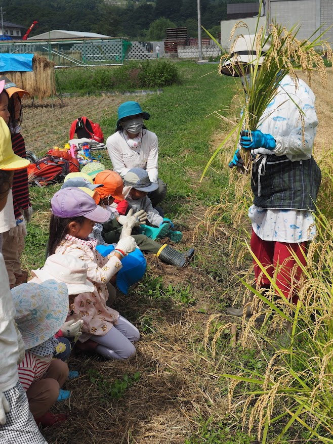 保育者の話を真剣に聴き、稲刈りへの期待を膨らませていました。