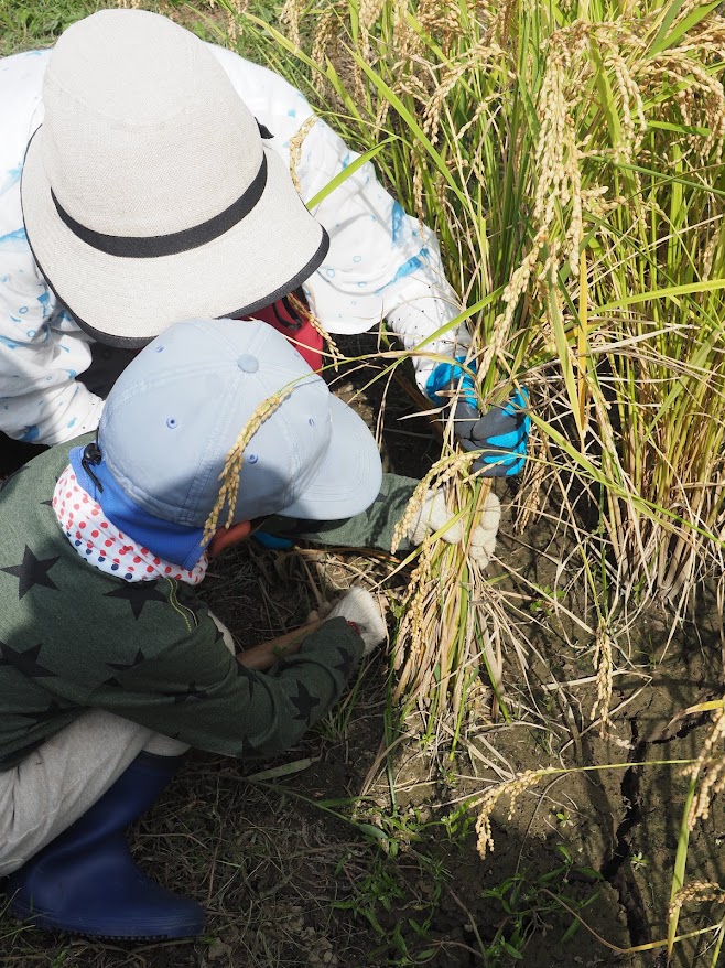 近くの田んぼでは、いつもお世話になっている農業塾の皆さんが稲刈りの最中だったので、少し見せていただきました。