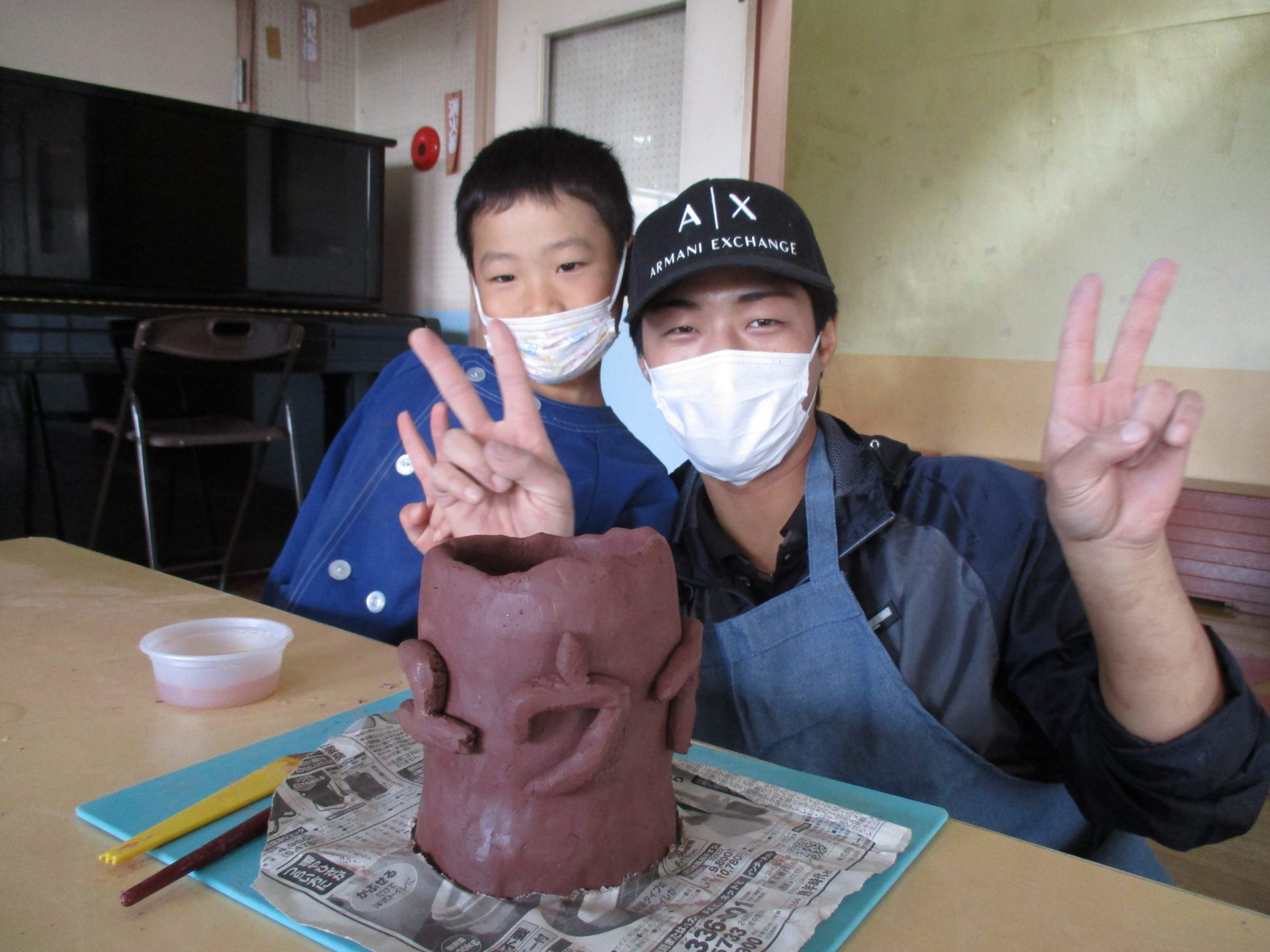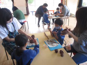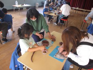 「土みたいな茶色い粘土だ!」「でも粘土のにおいはしない」いつも粘土遊びで使う油粘土との違いを体で感じながらの制作ができました。